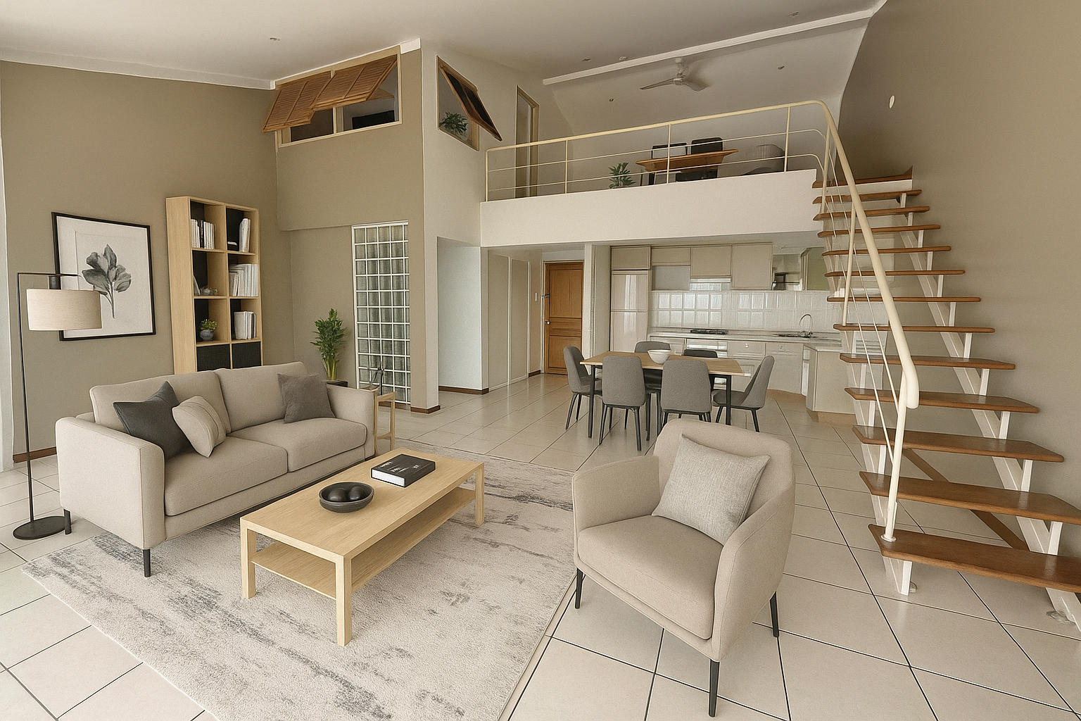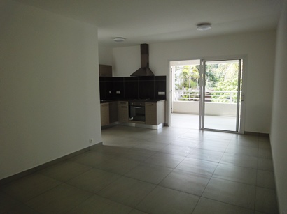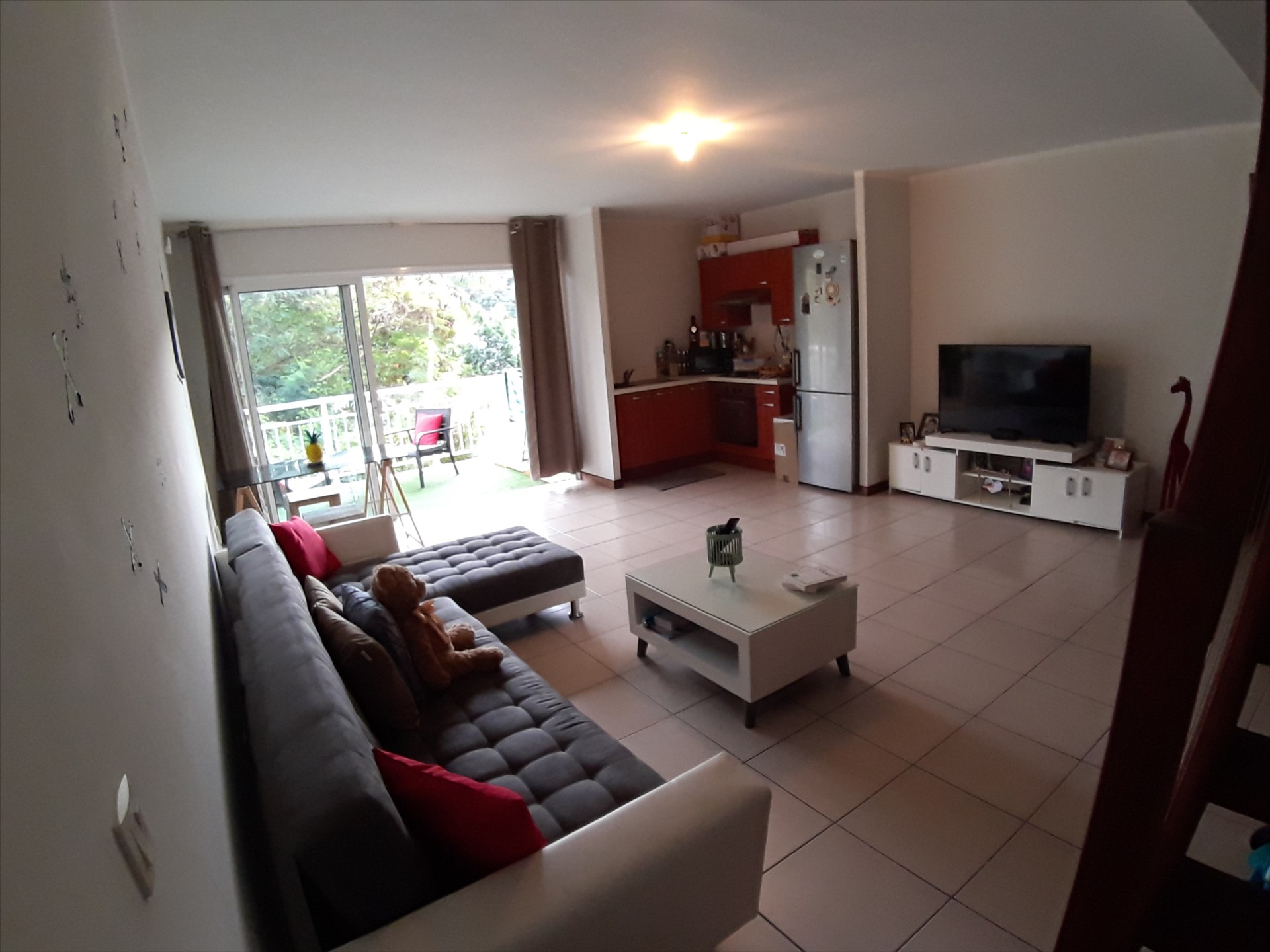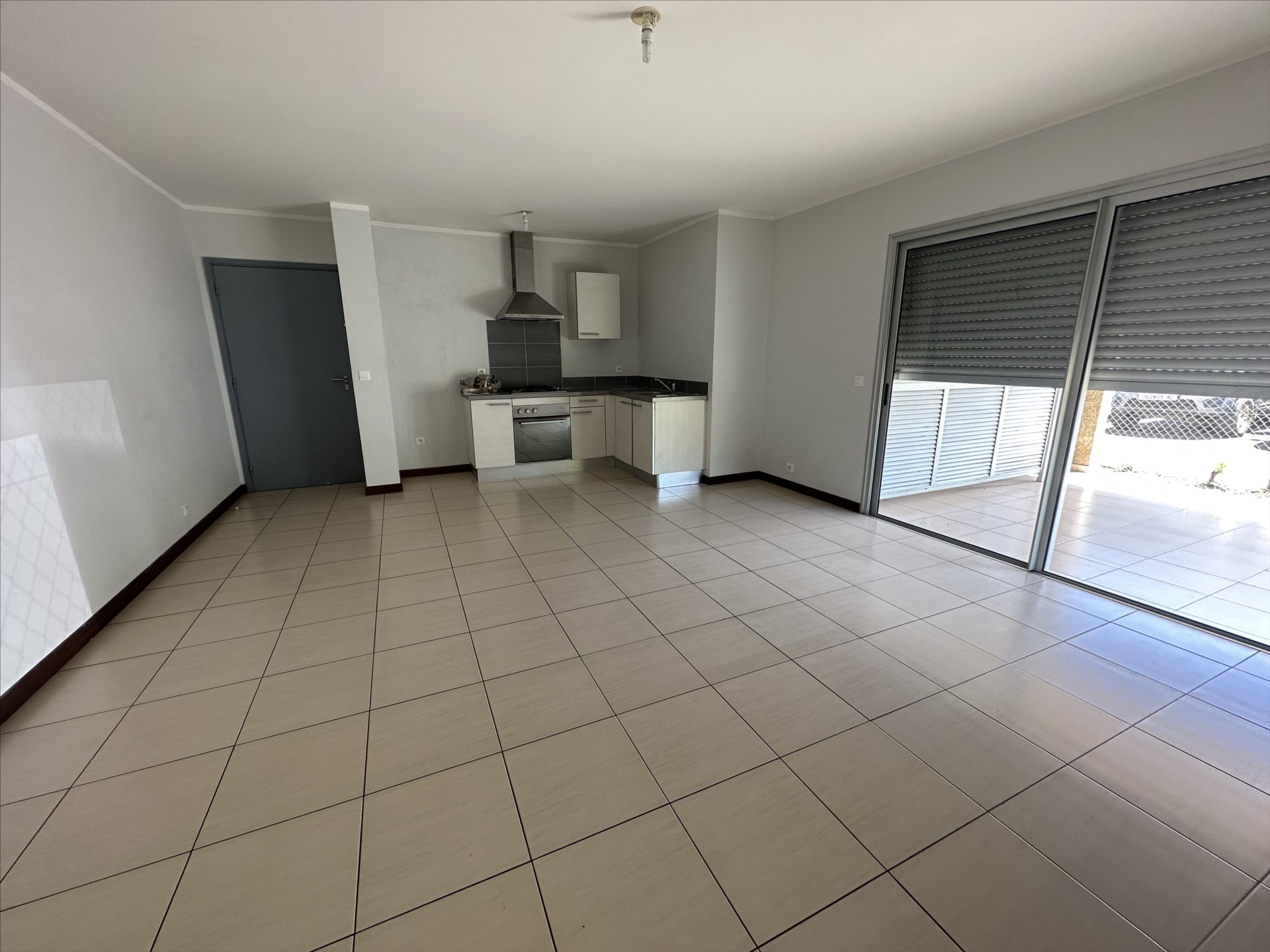 Séjour lumineux avec cuisine ouverte aménagée, donnant sur une terrasse couverte.