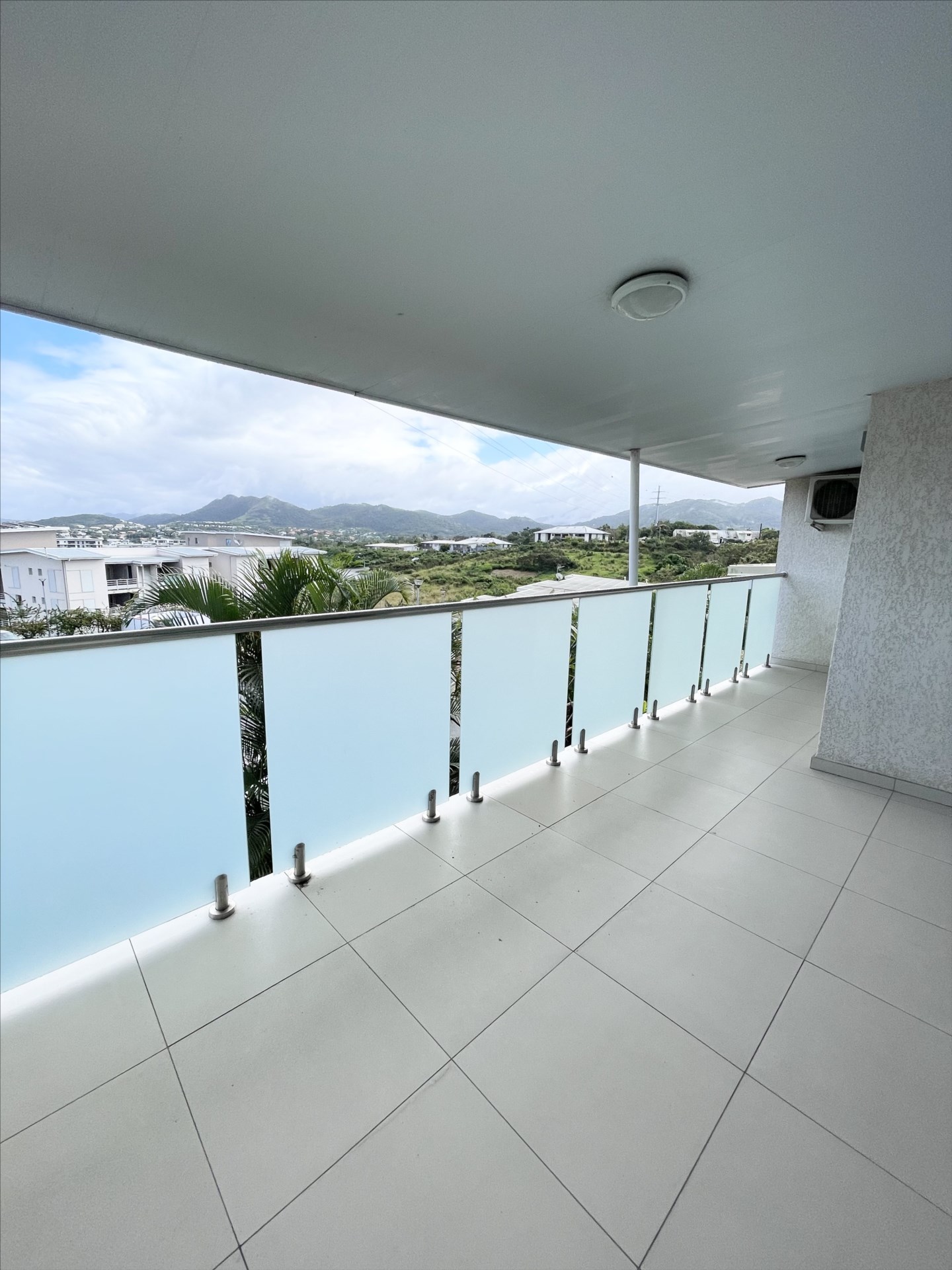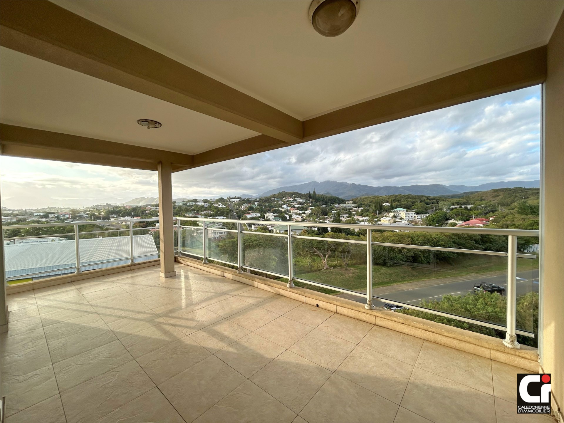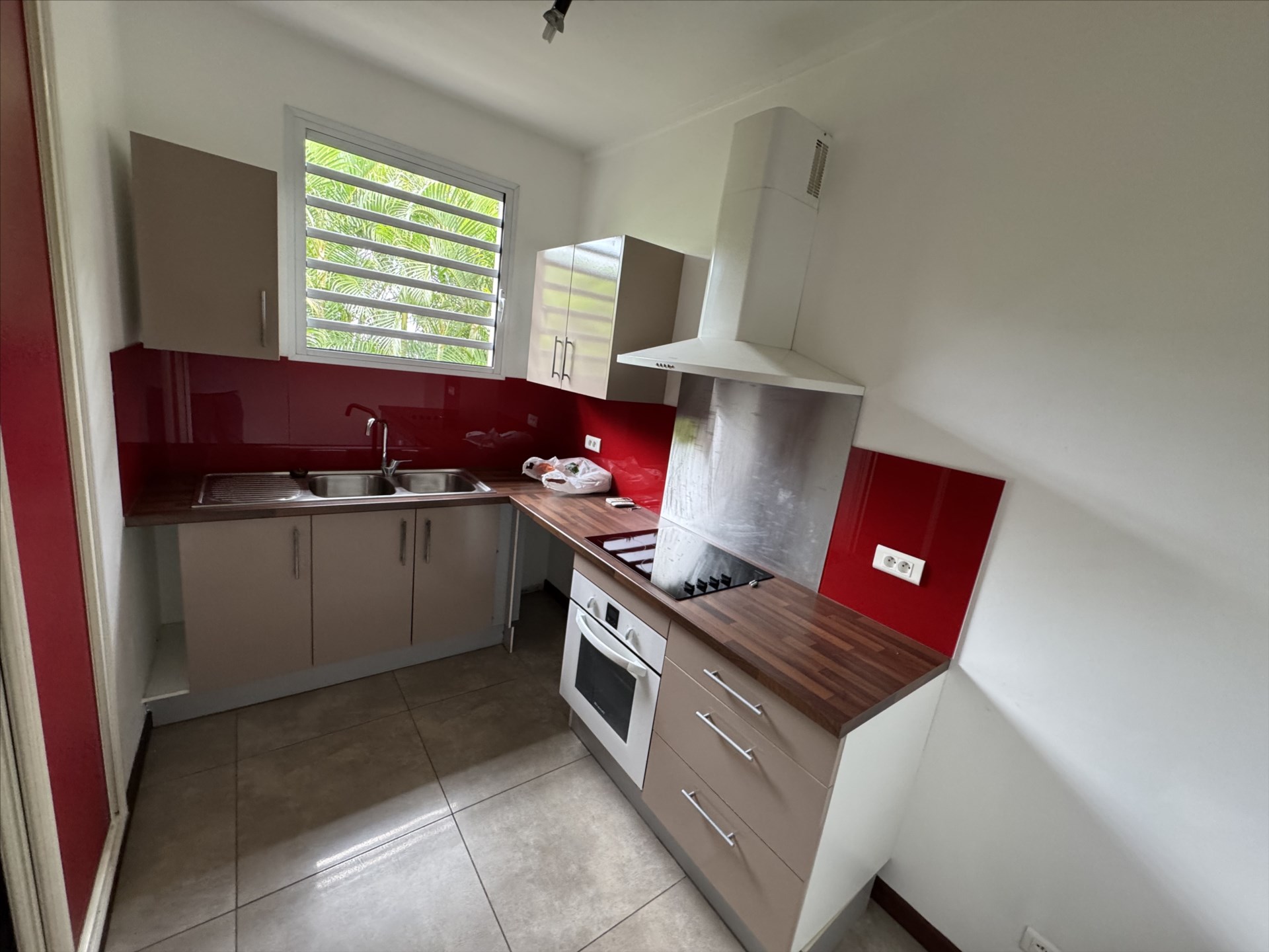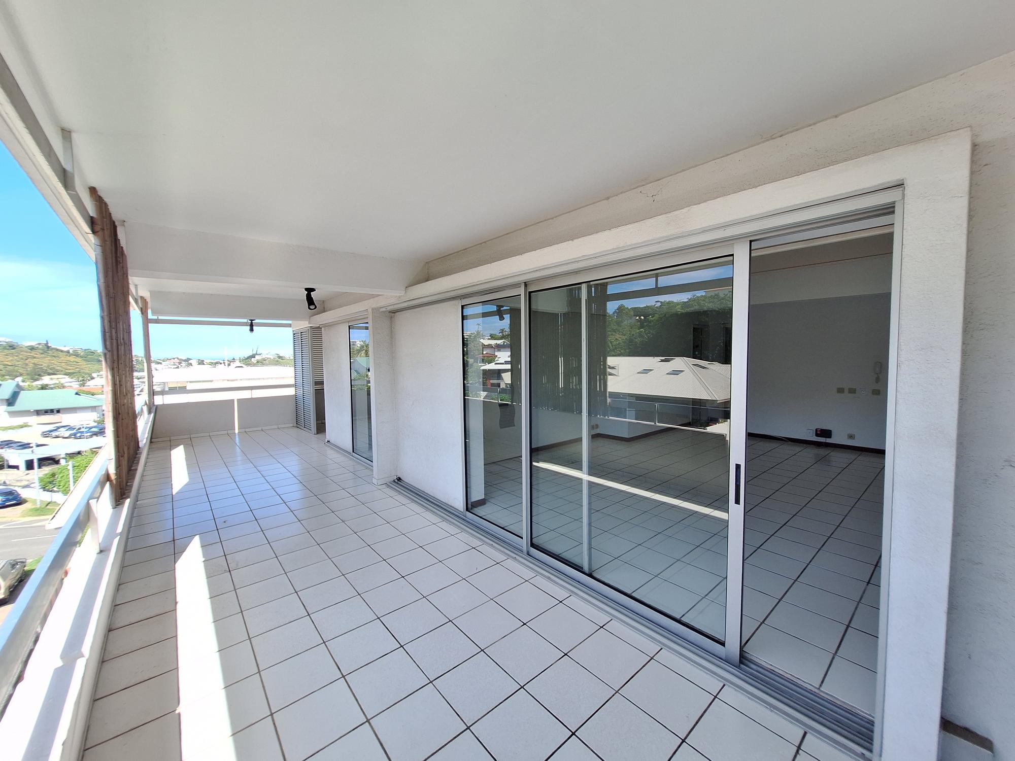 Séjour lumineux avec cuisine ouverte aménagée, donnant sur une terrasse couverte.