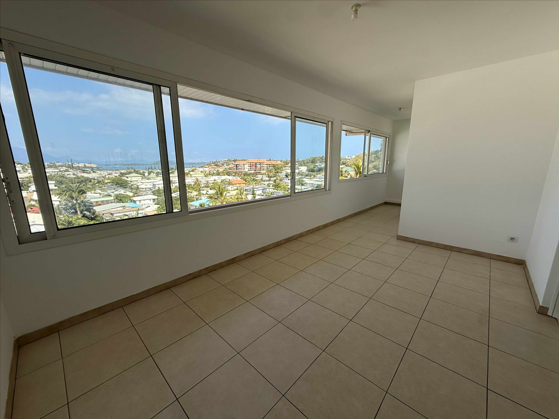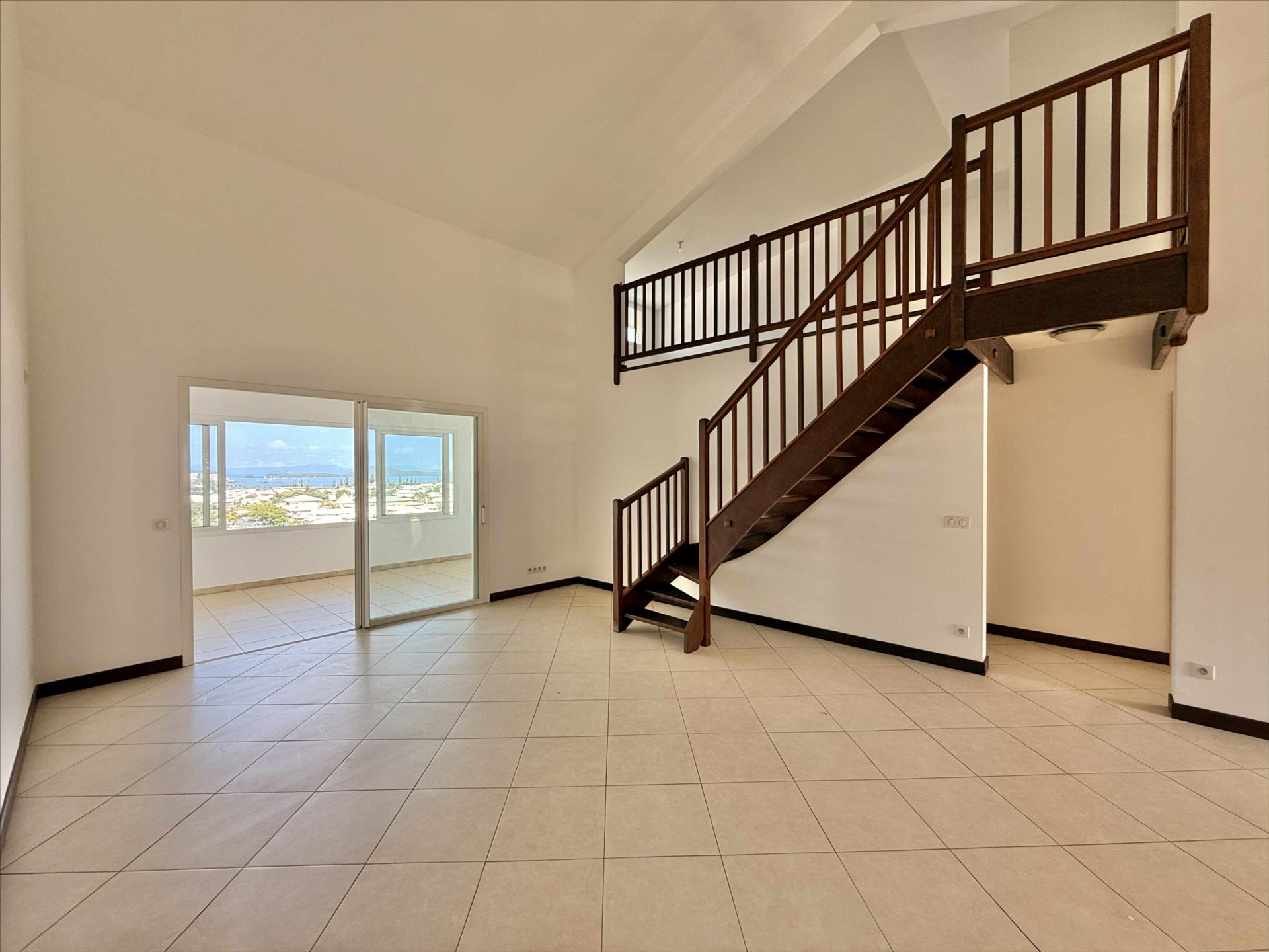 La partie du bas se compose d' une grande piece à vivre avec une belle hauteur sous plafond, d'une cuisine équipée ainsi qu'une terrasse fermée offrant une vue imprennable sur la baie de Sainte Marie !