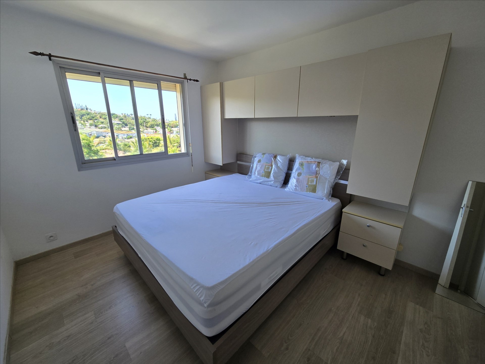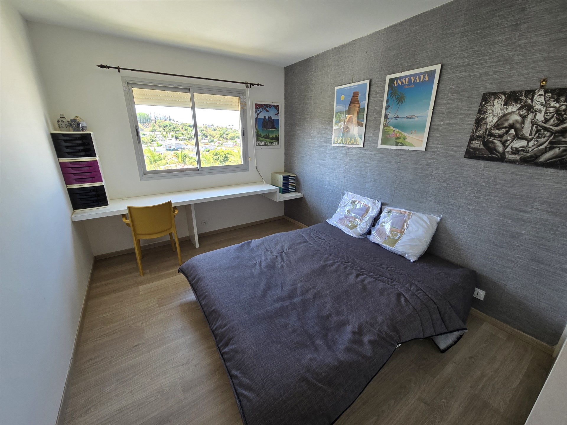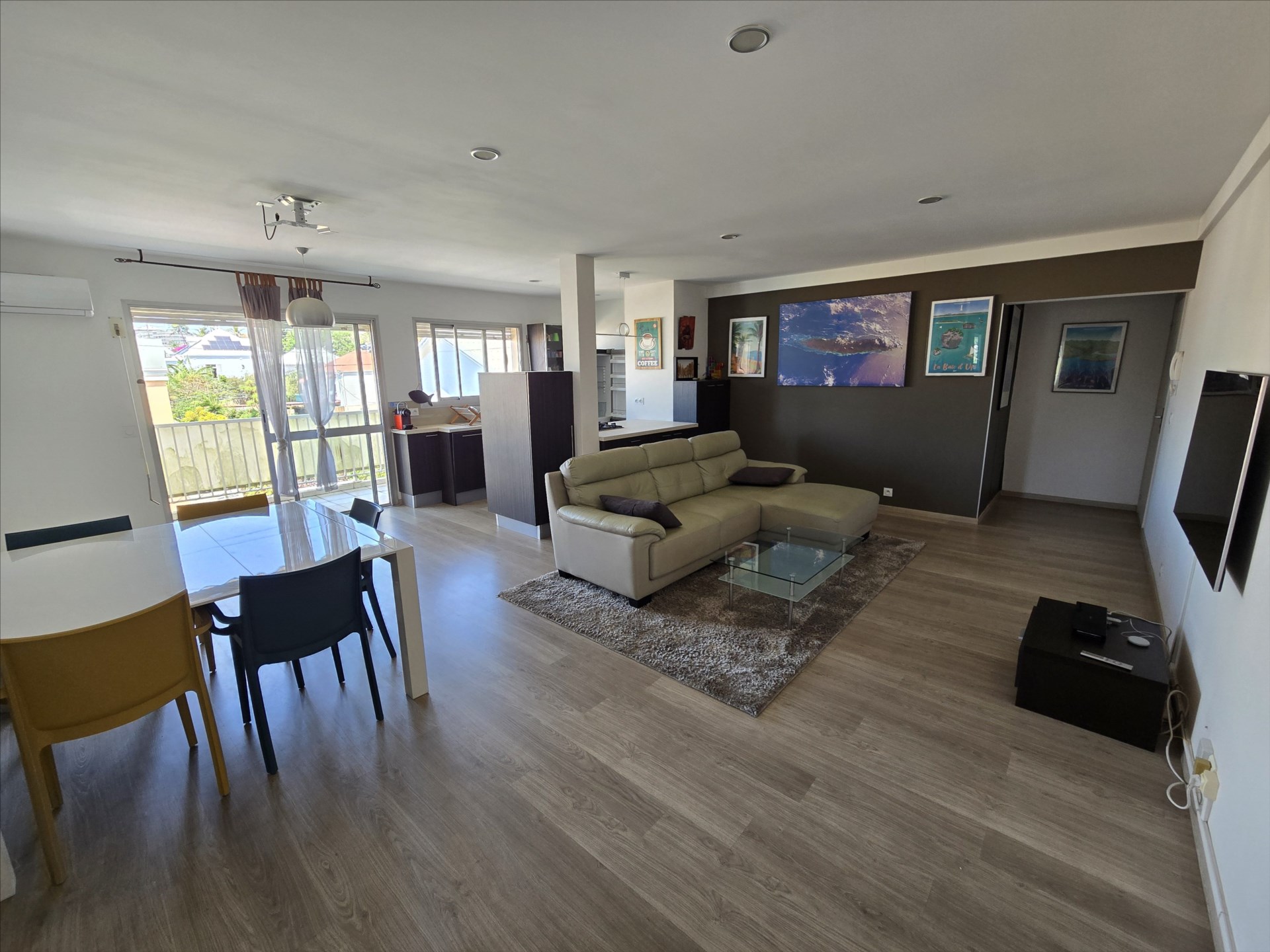 F3 de 72m², meublé et équipé, électroménager, vaisselles, linge de maison etc… séjour/cuisine, 2 chambres avec placard, salle d'eau, wc séparé, terrasse, climatisation, calme, cellier, 2 parkings sécurisés. 1er et dernier étage sans ascenseur. Eau et forfait électricité 10 000F compris. 21, boulevard Extérieur, à 2 pas du tribunal et à 10 mns des plages. Bail de 6 mois minimum. Libre!