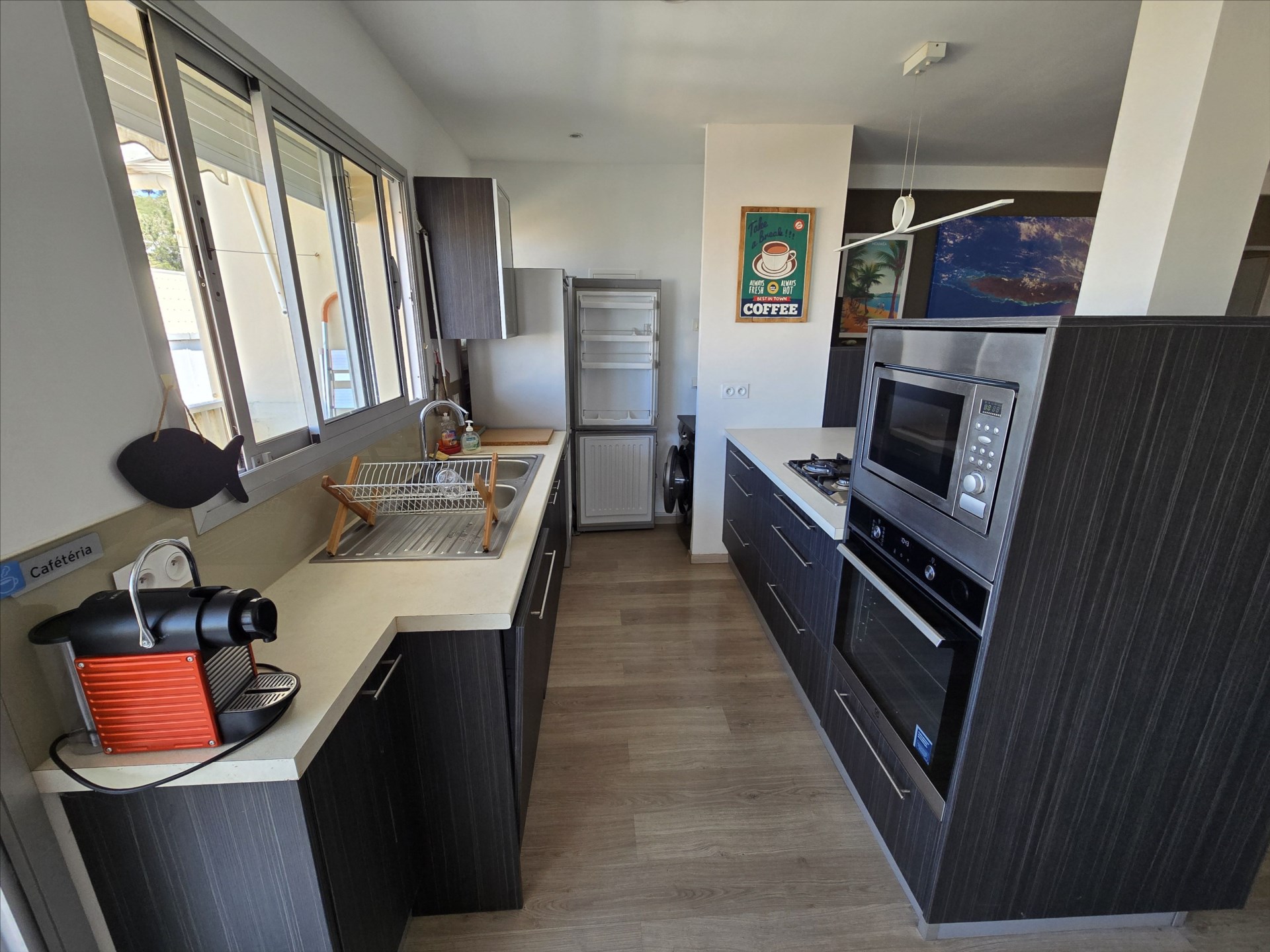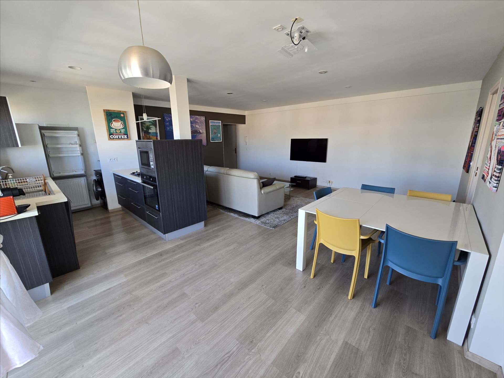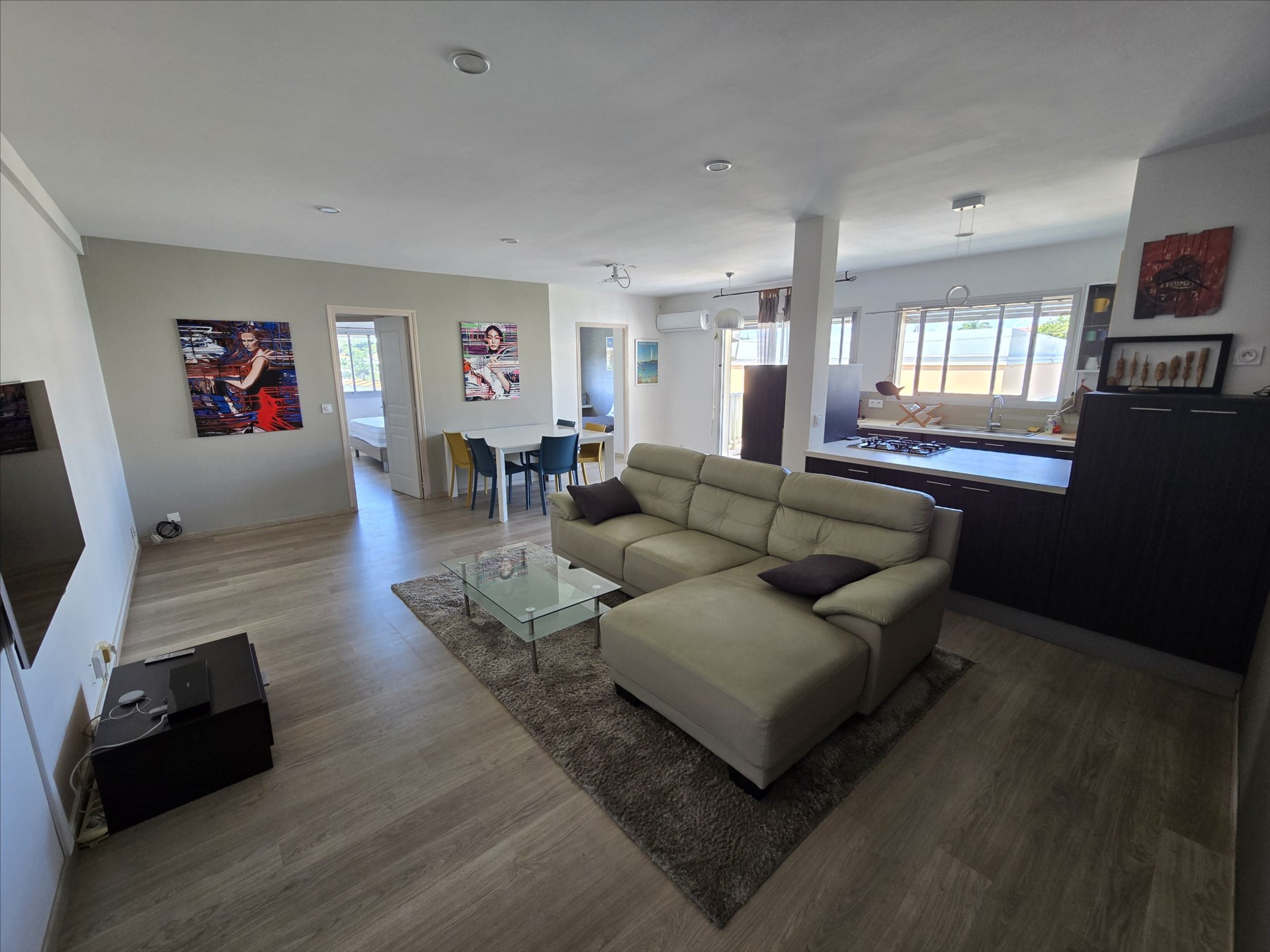 F3 de 72m², meublé et équipé, électroménager, vaisselles, linge de maison etc… séjour/cuisine, 2 chambres avec placard, salle d'eau, wc séparé, terrasse, climatisation, calme, cellier, 2 parkings sécurisés. 1er et dernier étage sans ascenseur. Eau et forfait électricité 10 000F compris. 21, boulevard Extérieur, à 2 pas du tribunal et à 10 mns des plages. Bail de 6 mois minimum. Libre!