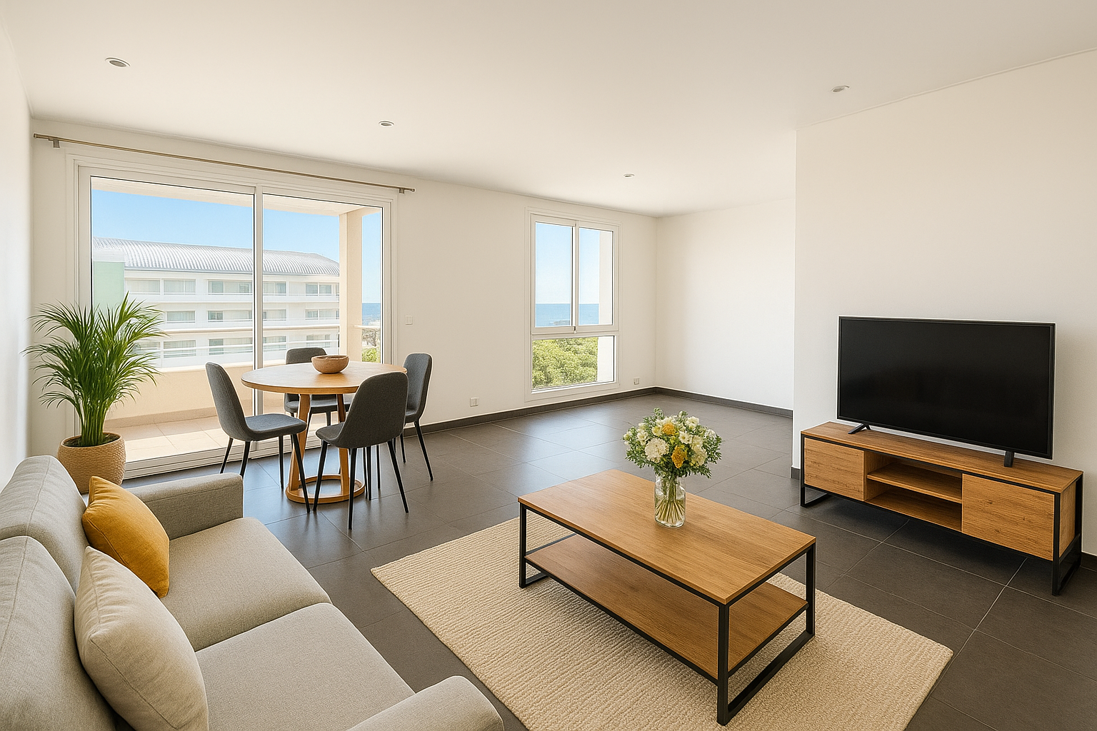 L’appartement se compose de deux chambres climatisées avec placards, dont une suite parentale avec salle de bain, ainsi qu’une salle d’eau indépendante. La cuisine équipée s’ouvre sur un vaste séjour lumineux donnant accès à une terrasse couverte de 20 m2 , avec buanderie et offrant une superbe vue mer.