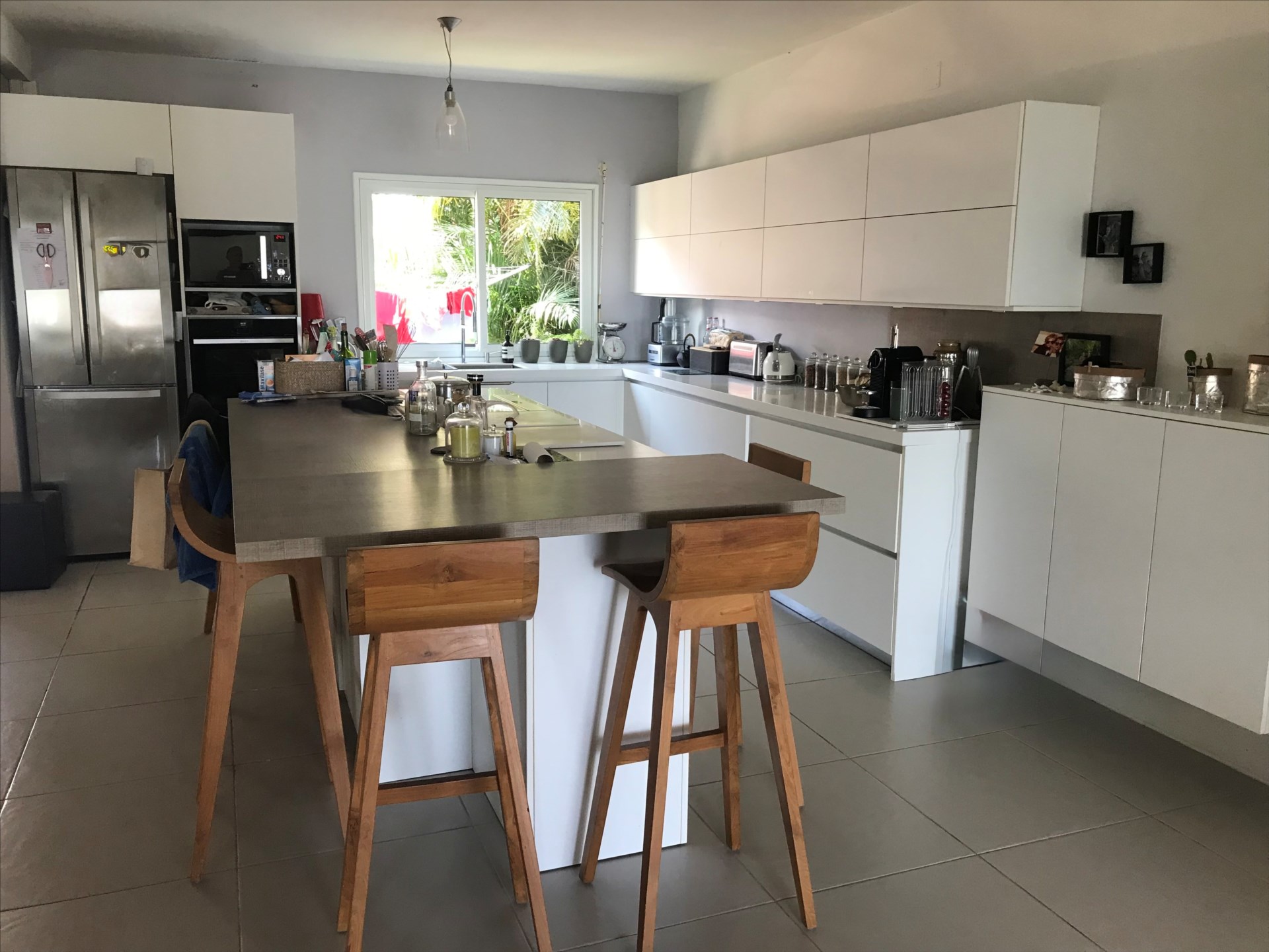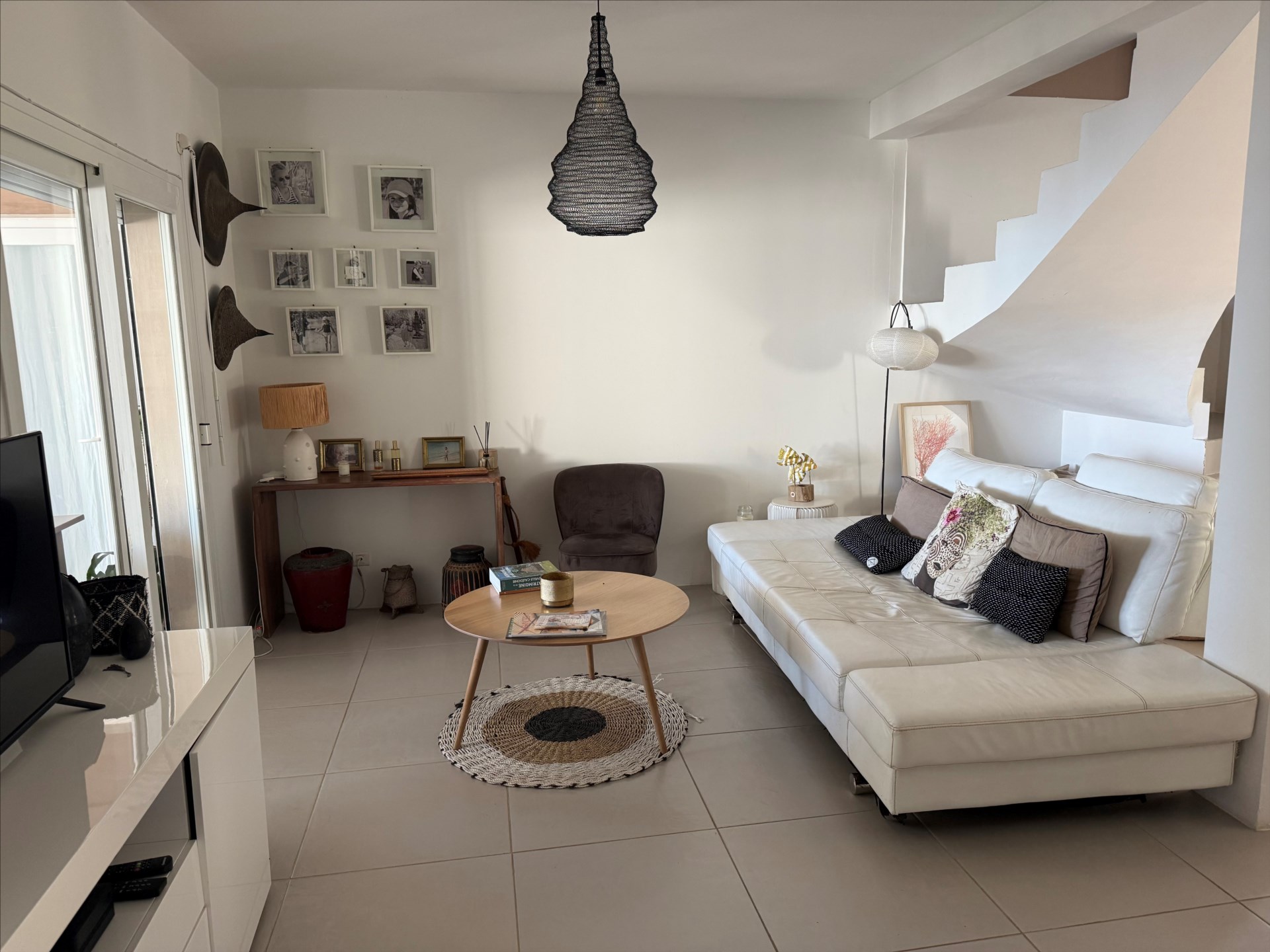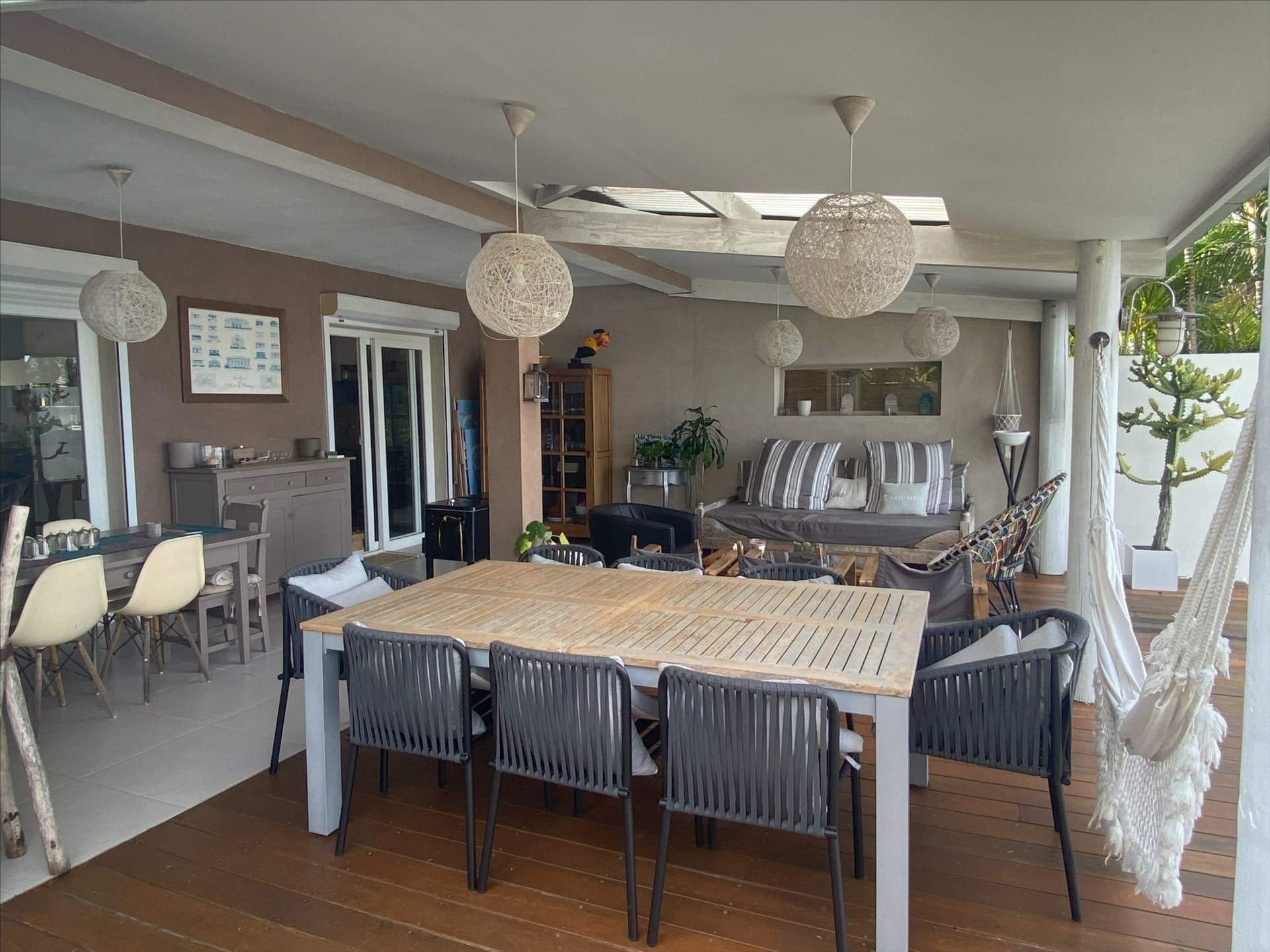 Le rez-de-chaussée s’ouvre sur un grand séjour lumineux avec cuisine ouverte, prolongé par une terrasse couverte aménagée pour vivre dehors tout au long de la journée.