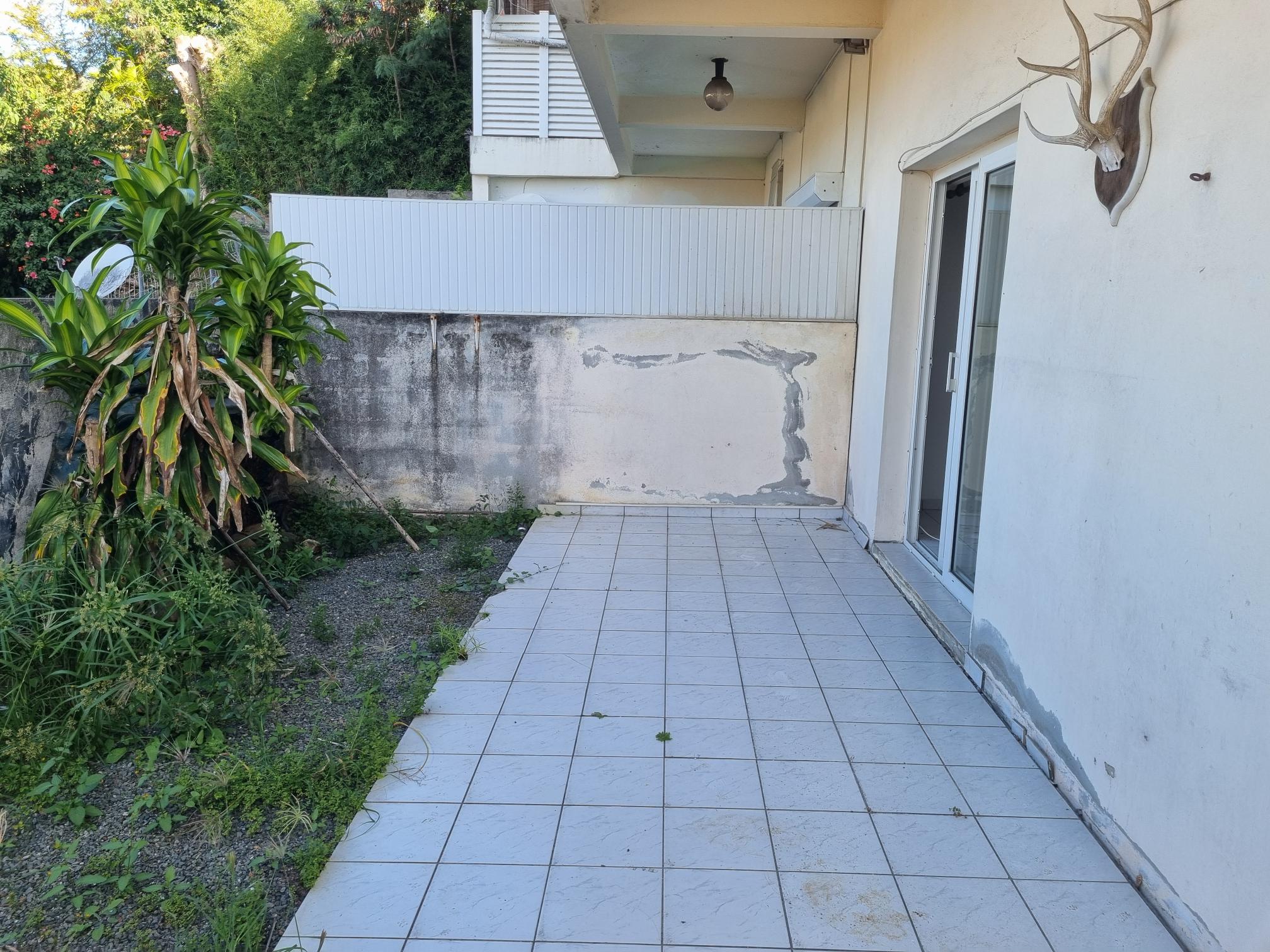 Cuisine ouverte sur séjour, terrasse couverte, chambre avec placard.