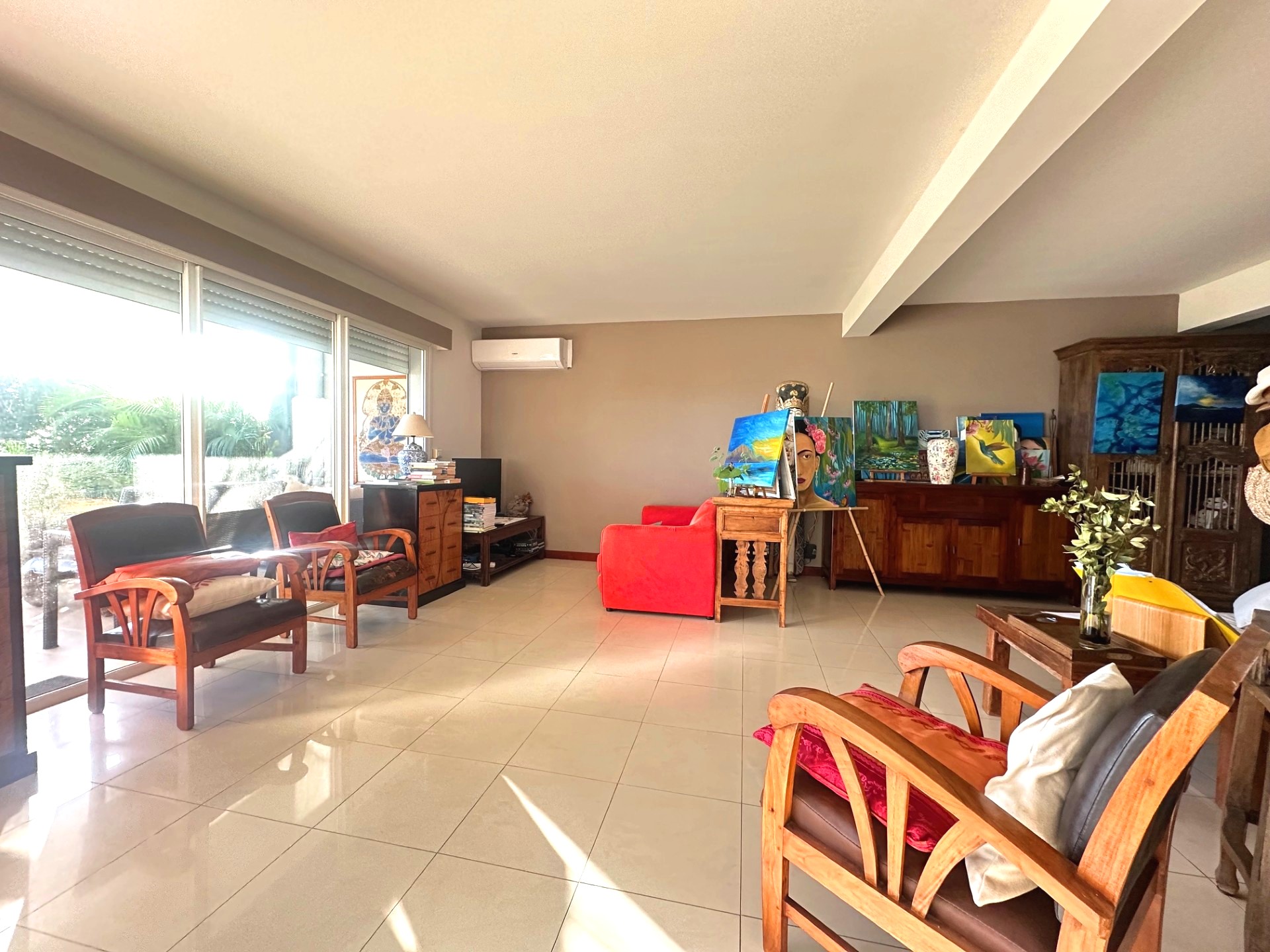 Vous disposerez en partie jour d'une cuisine équipée (plaque, four et hotte) donnant sur un grand séjour climatisée et une buanderie.