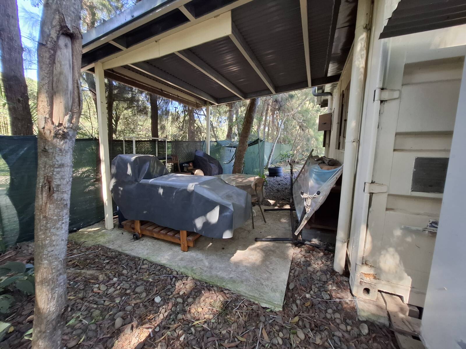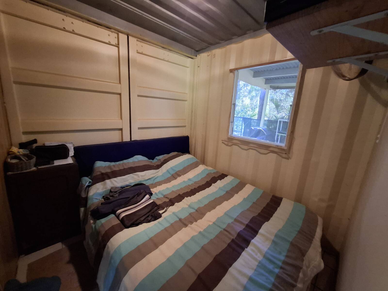 Un container équipé d’un chauffe-eau solaire a été aménagé d’une kitchenette, d’un espace nuit avec salle d’eau et wc, d’une terrasse couverte attenante, et d’une petite terrasse à l’arrière.