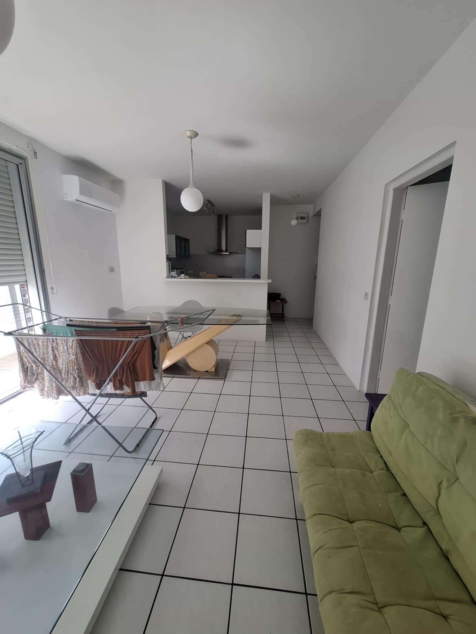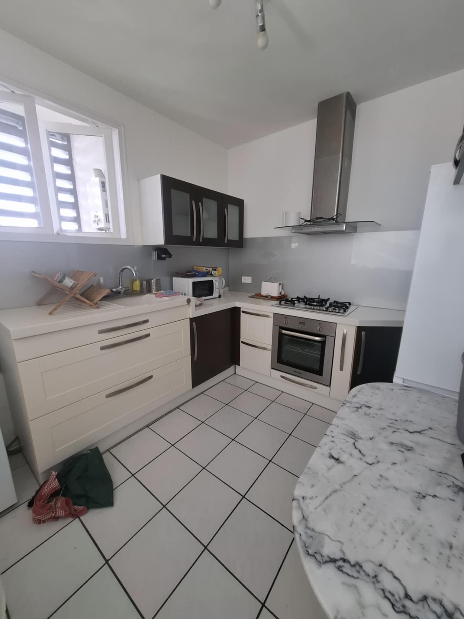 Une cuisine équipée et aménagée ouverte sur un séjour lumineux climatisé.