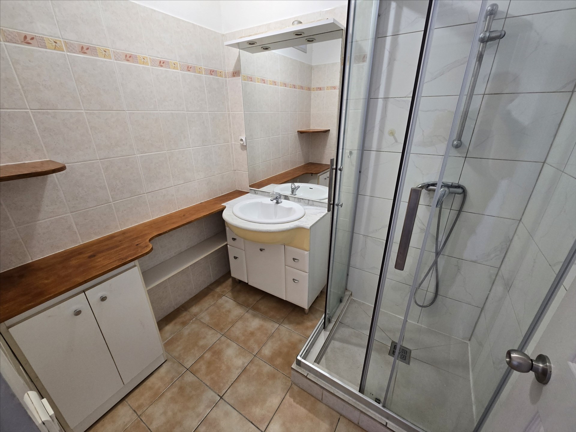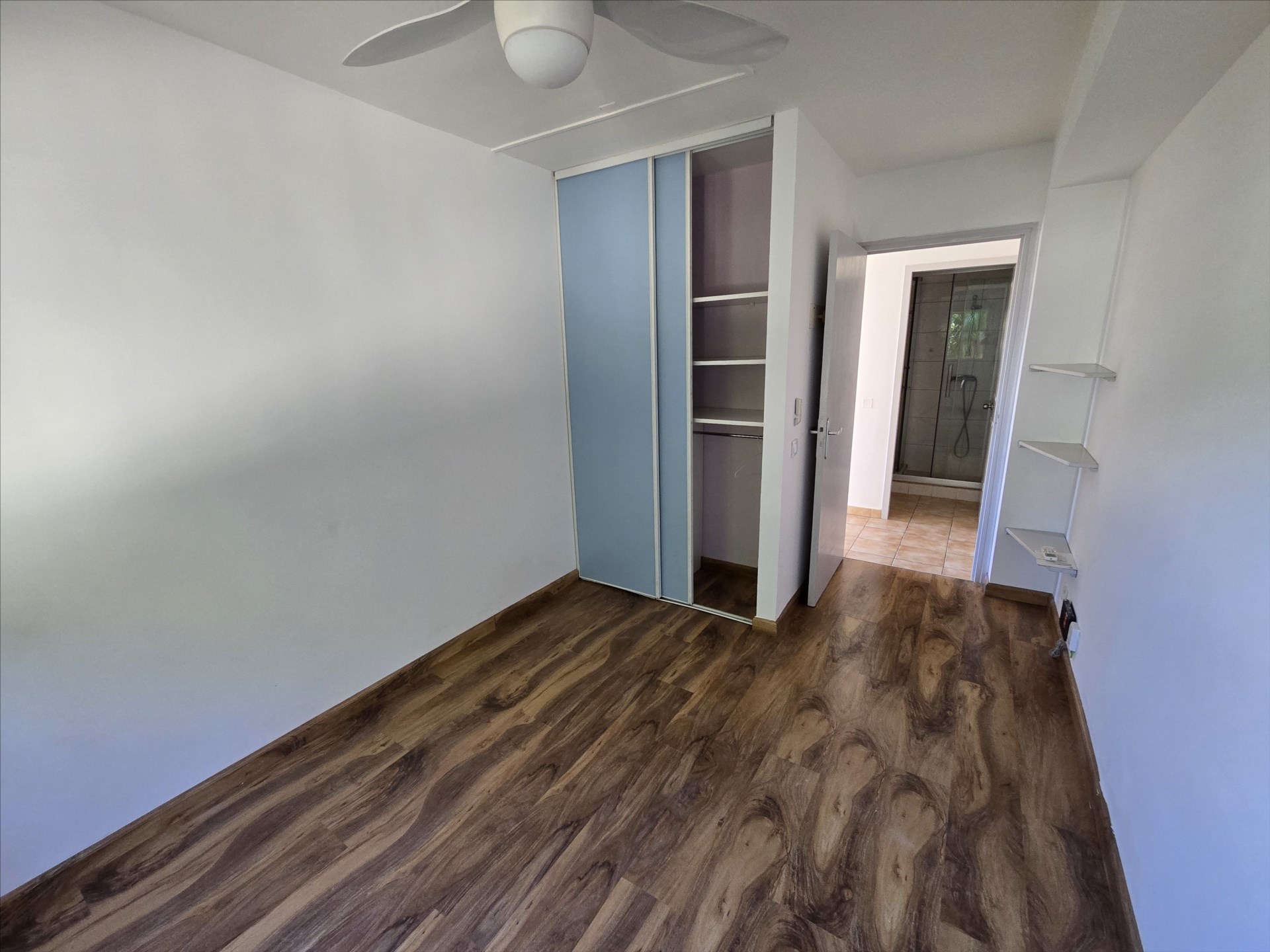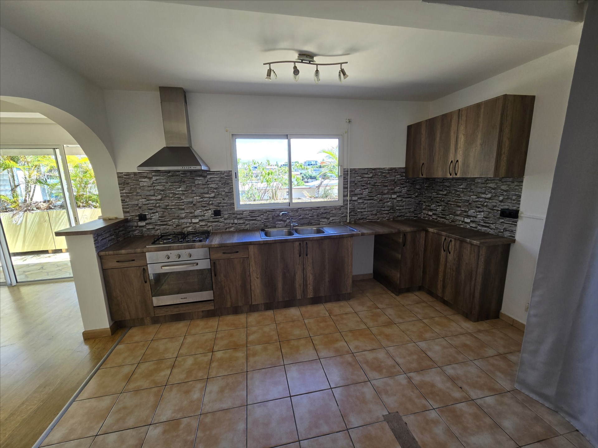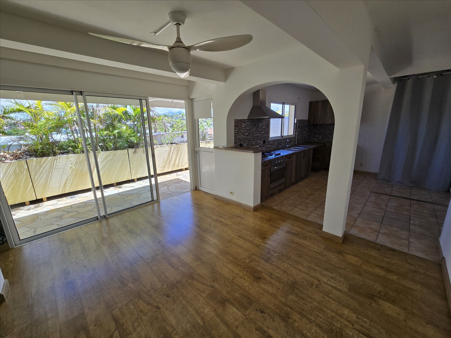 F3 de 60m², en rez de chaussée, séjour, cuisine équipée, deux chambres avec placard, salle d’eau, wc, grande terrasse, 1 place de parking, calme, en impasse, rue Bon. Libre!