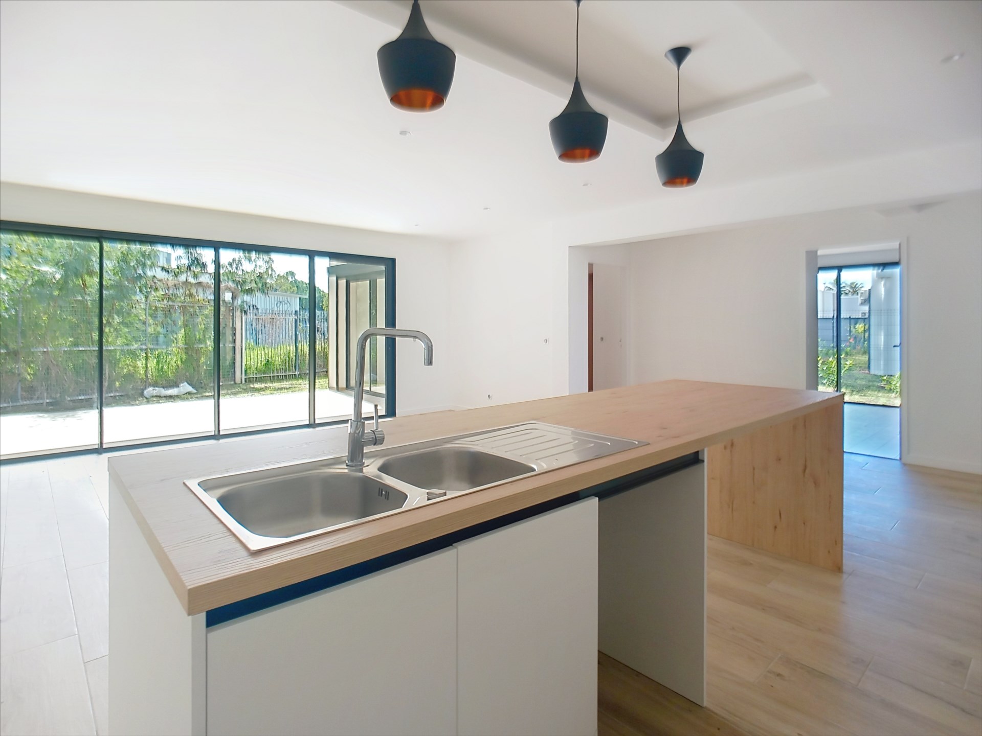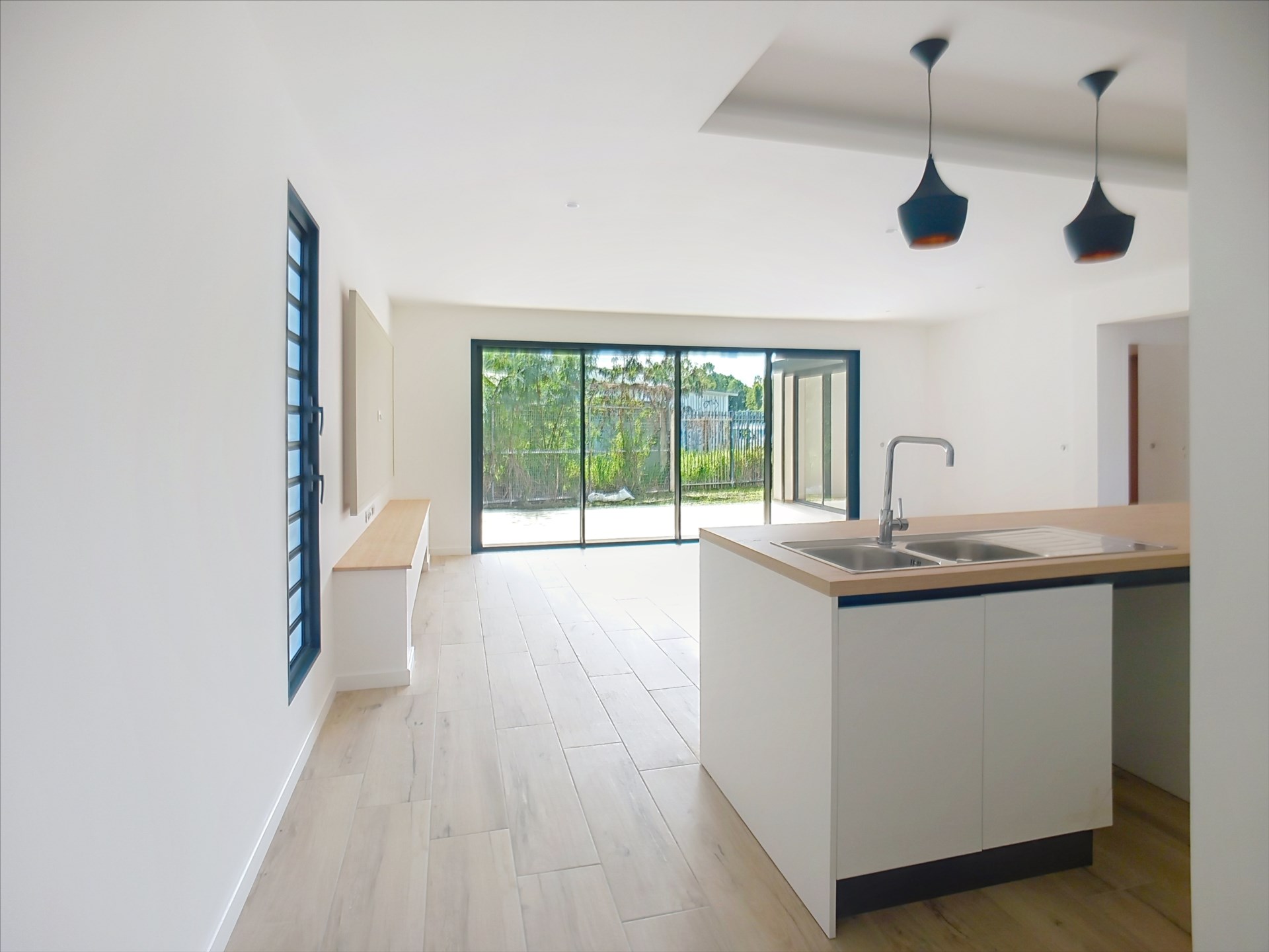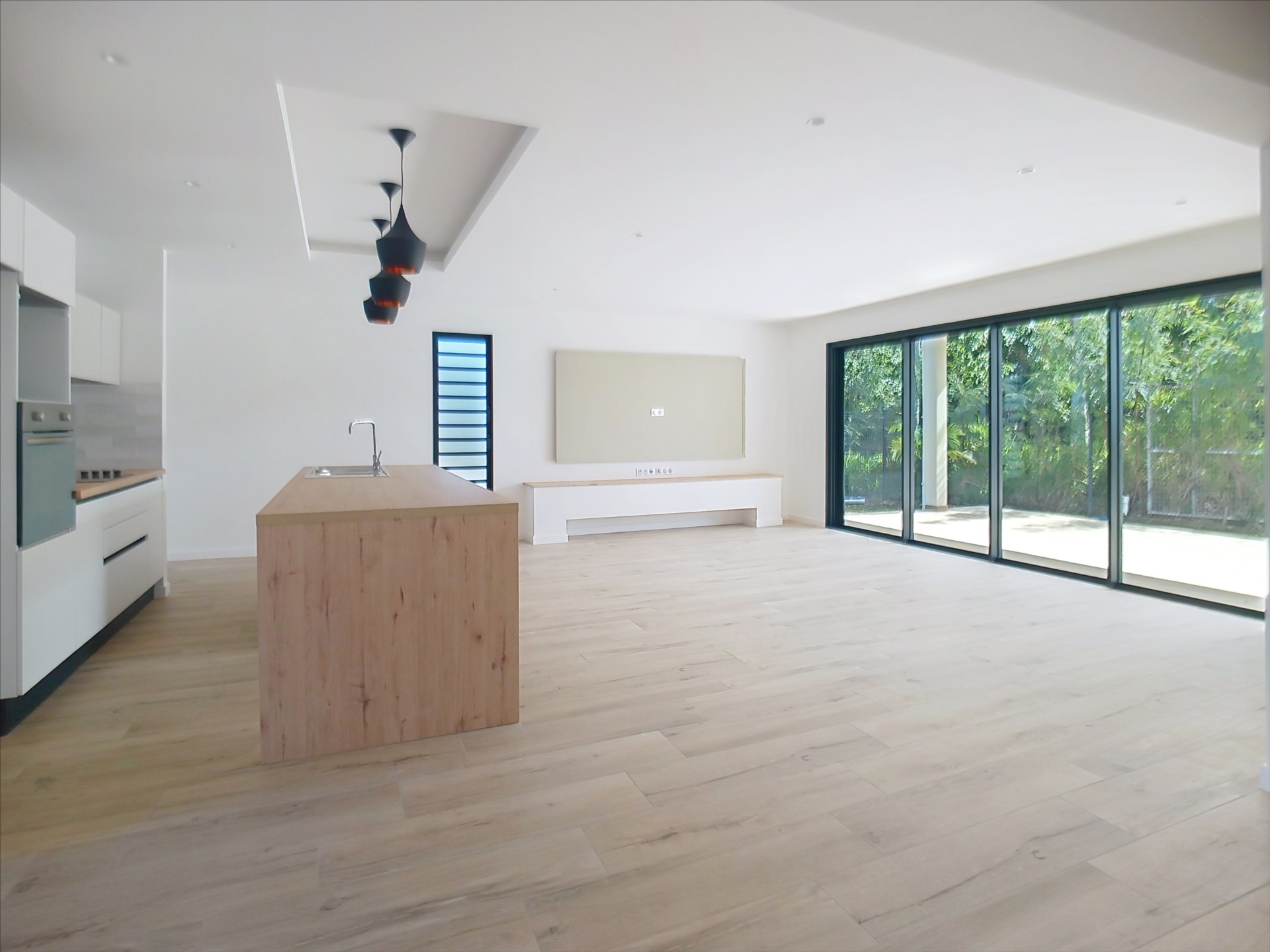 Villa moderne de type F5 en étage d'une superficie habitable de 141,90 m² comprenant au rez-de-chaussée une cuisine semi équipée, ouverte sur un séjour.
