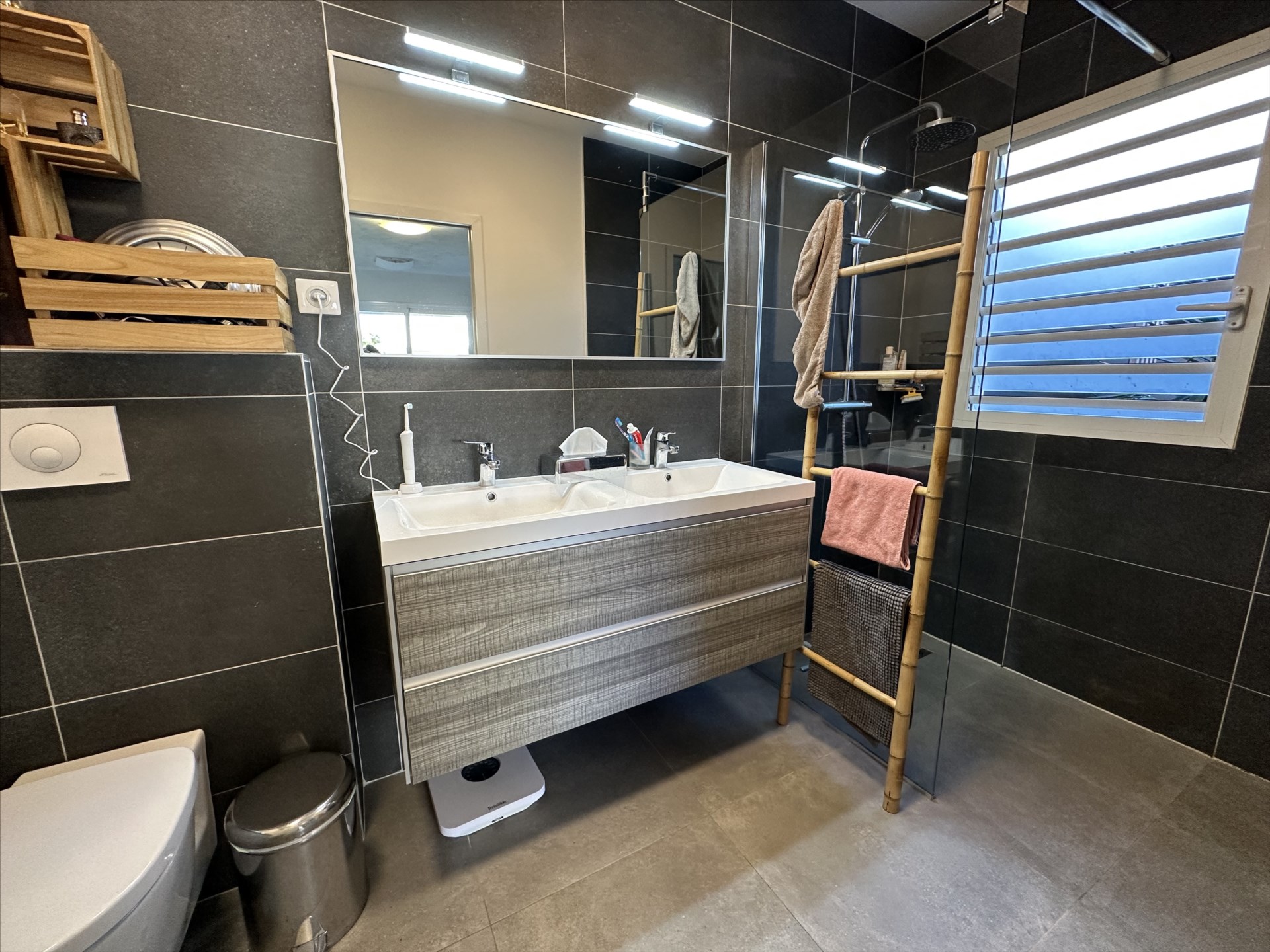 En partie nuit 2 chambres climatisées avec placard et volet roulant, une salle d'eau, un wc indépendant avec lave main, ainsi qu'une suite parentale climatisée avec dressing + placard, et salle d'eau avec douche à l'italienne et WC.