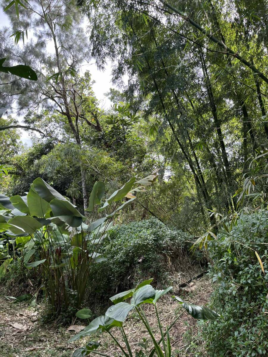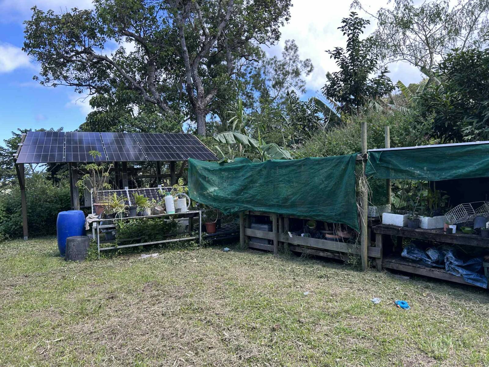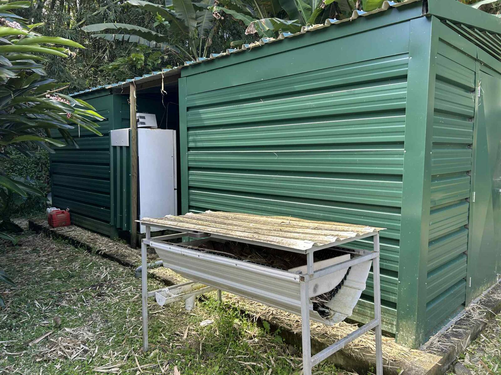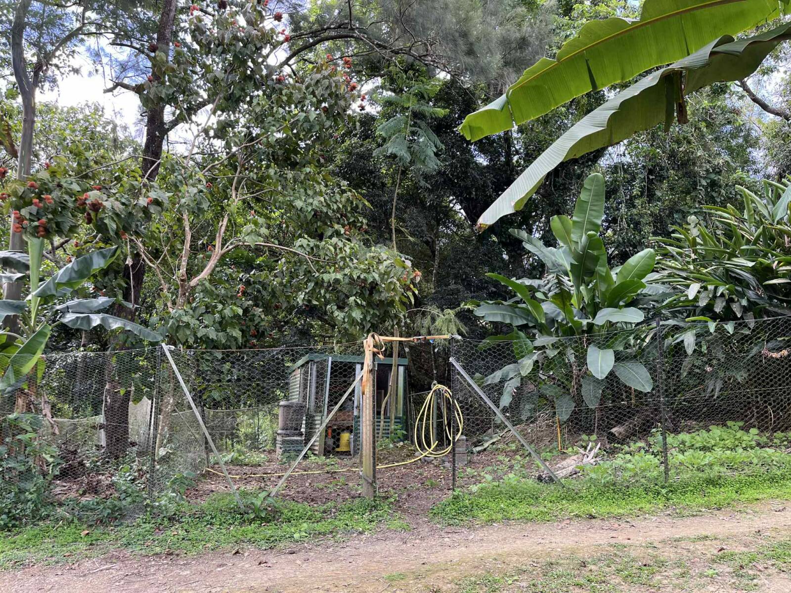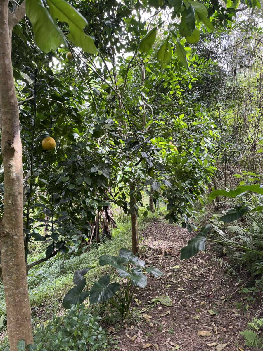 Sur la partie la plus pentue qui a été segmentée, 6000 m2 sont exploités pour un jardin en permaculture irrigués par arrosage automatique, avec 70 buttes de permaculture certifiés Bio Calédonia depuis 6 ans, 65 sortes de fruitiers ; orangers, mandariniers, citronniers, des caramboles… 100 bananiers, et une emplacement pour une vanilleraie de 200 pieds qu’il conviendra de relancer (en place 70 poteaux de Gaiacs).