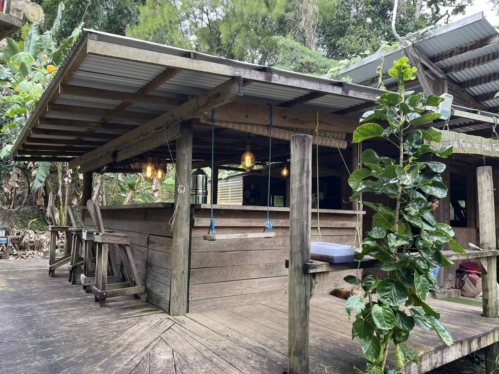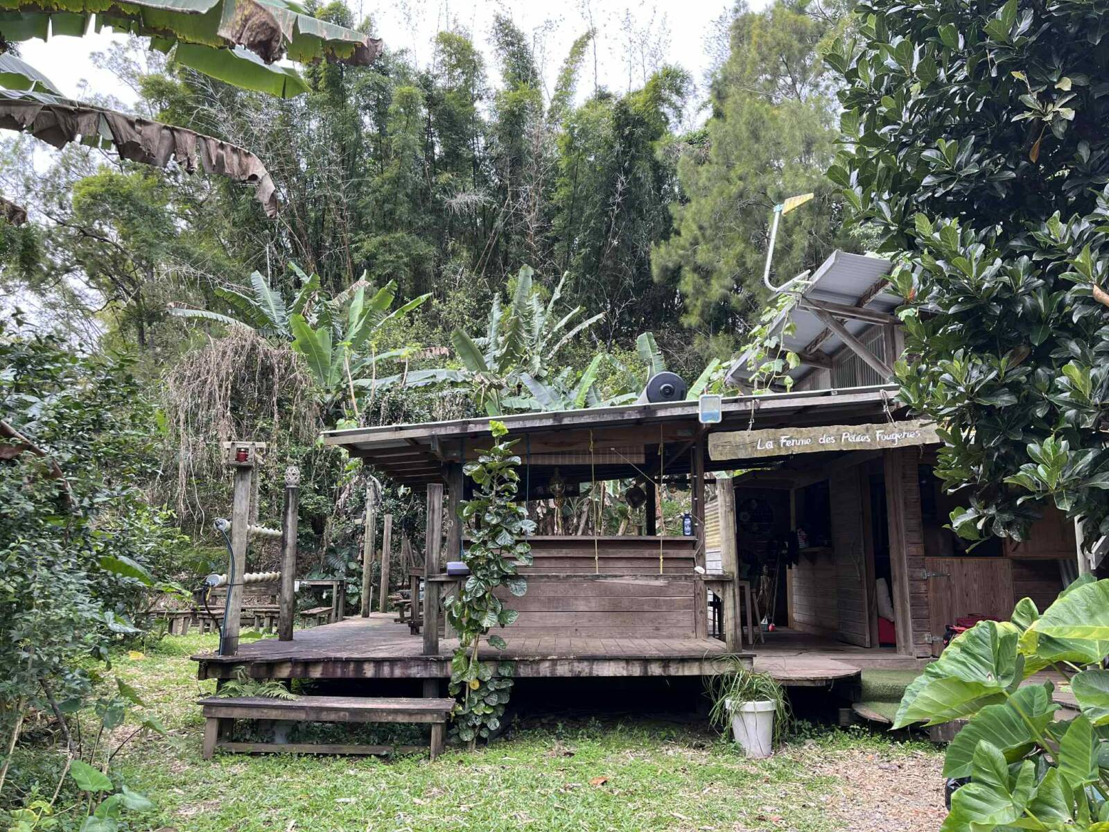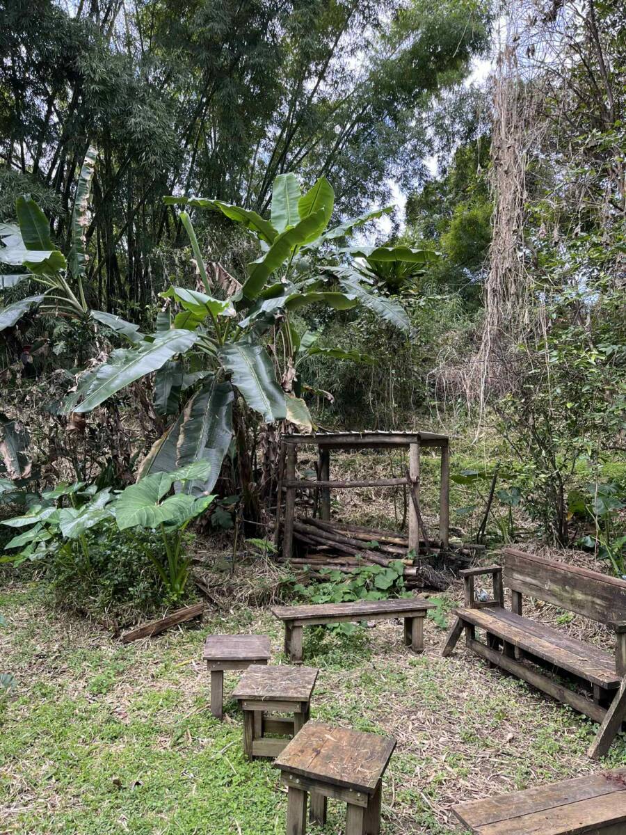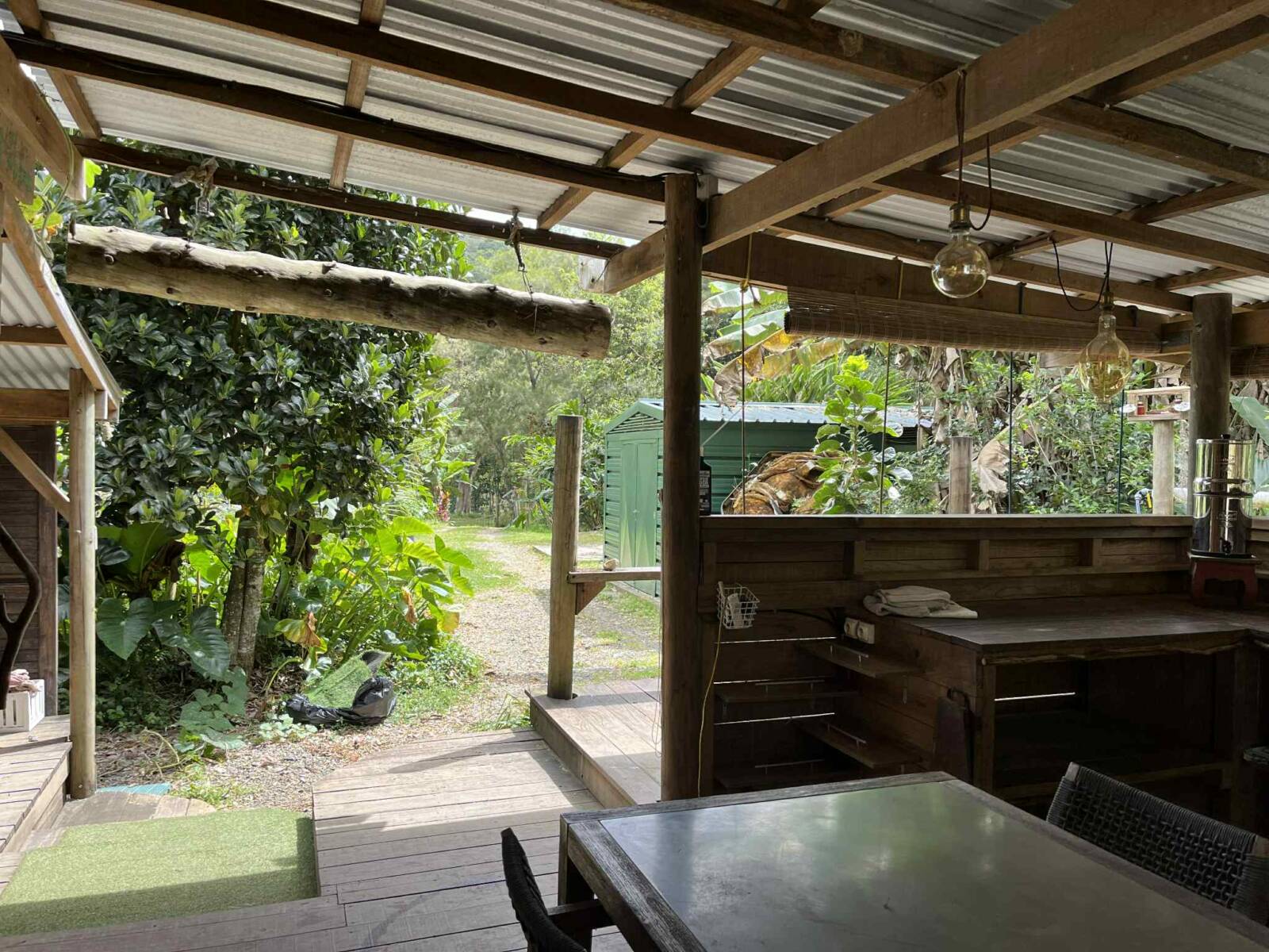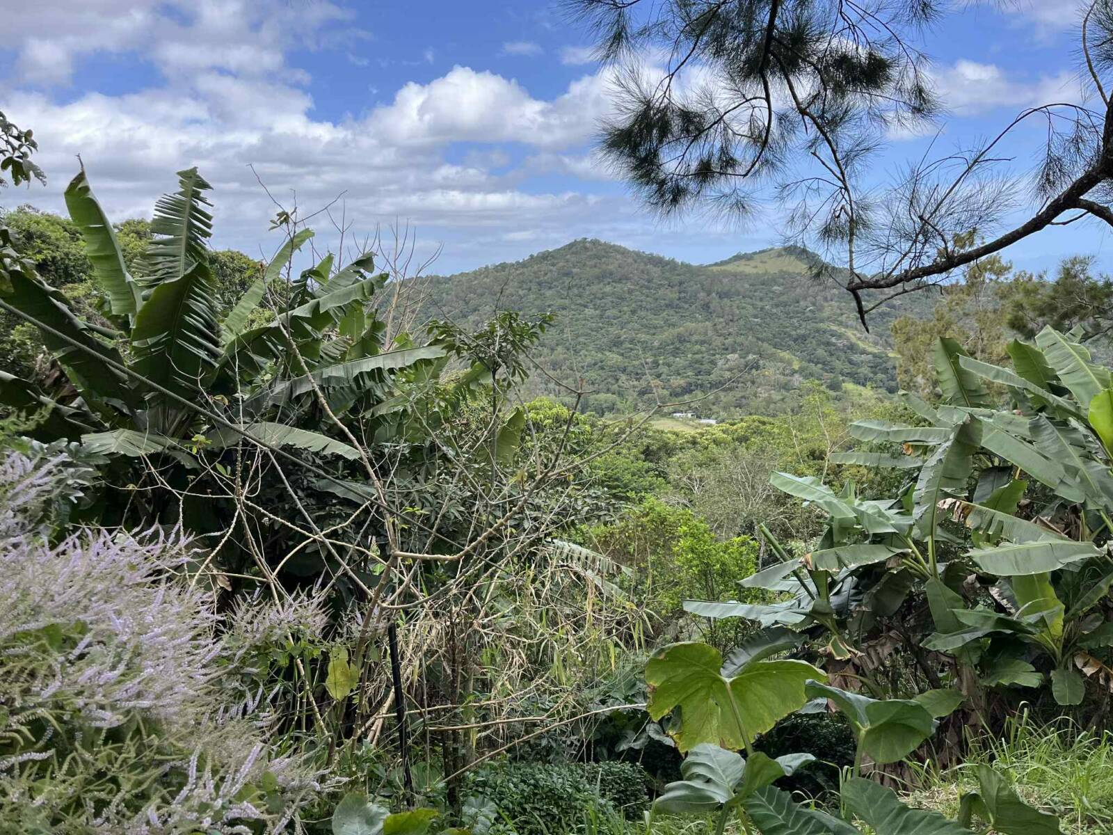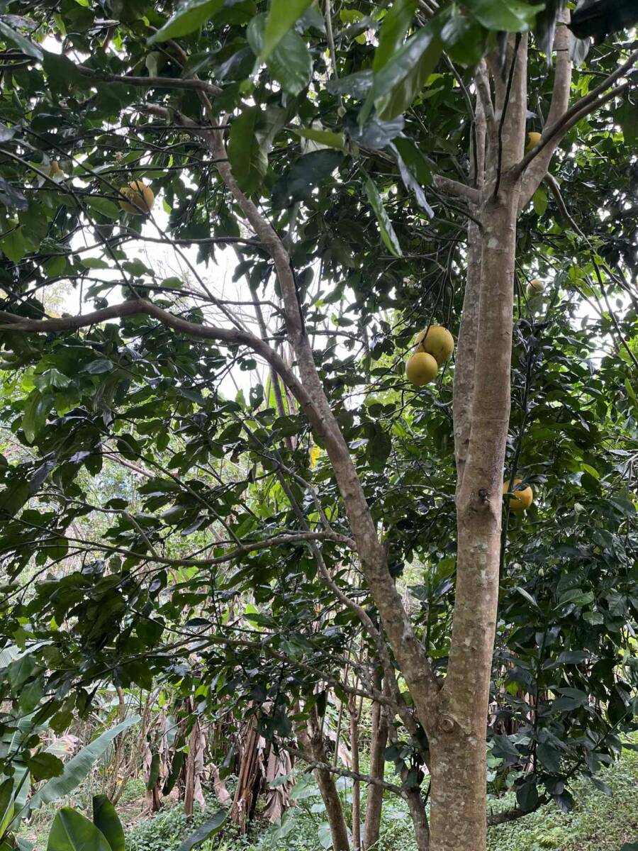 Sur la partie la plus pentue qui a été segmentée, 6000 m2 sont exploités pour un jardin en permaculture irrigués par arrosage automatique, avec 70 buttes de permaculture certifiés Bio Calédonia depuis 6 ans, 65 sortes de fruitiers ; orangers, mandariniers, citronniers, des caramboles… 100 bananiers, et une emplacement pour une vanilleraie de 200 pieds qu’il conviendra de relancer (en place 70 poteaux de Gaiacs).