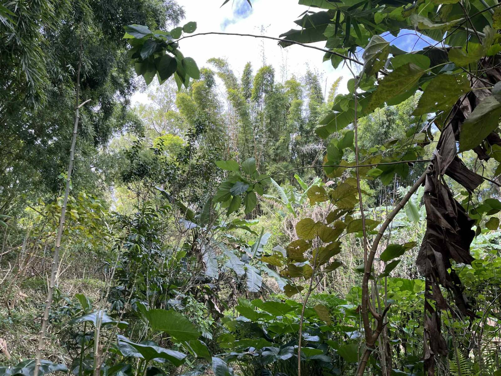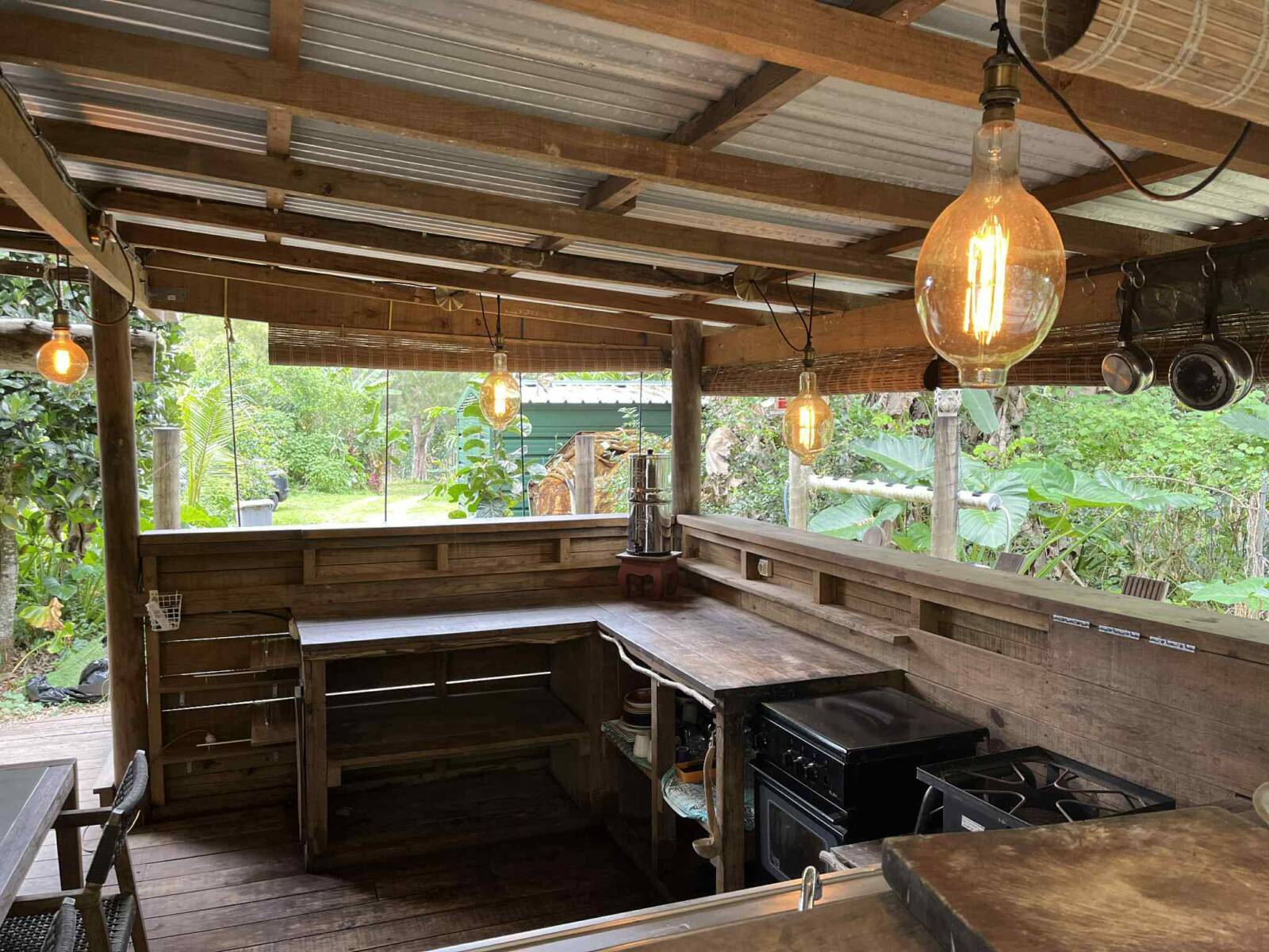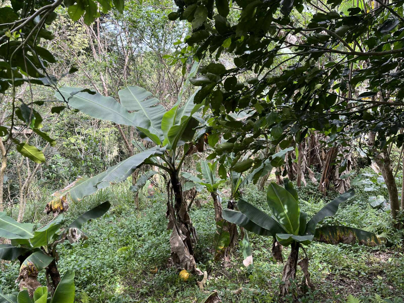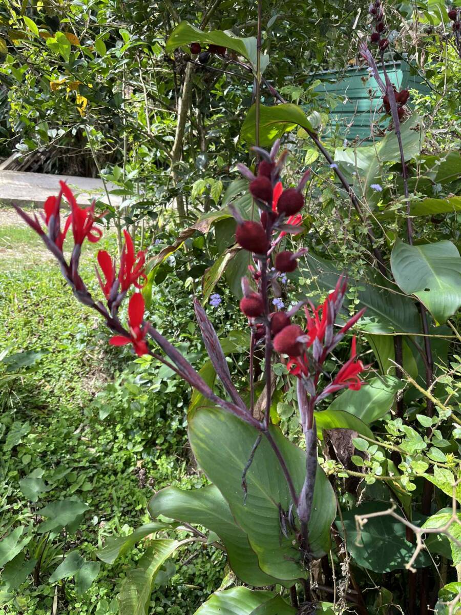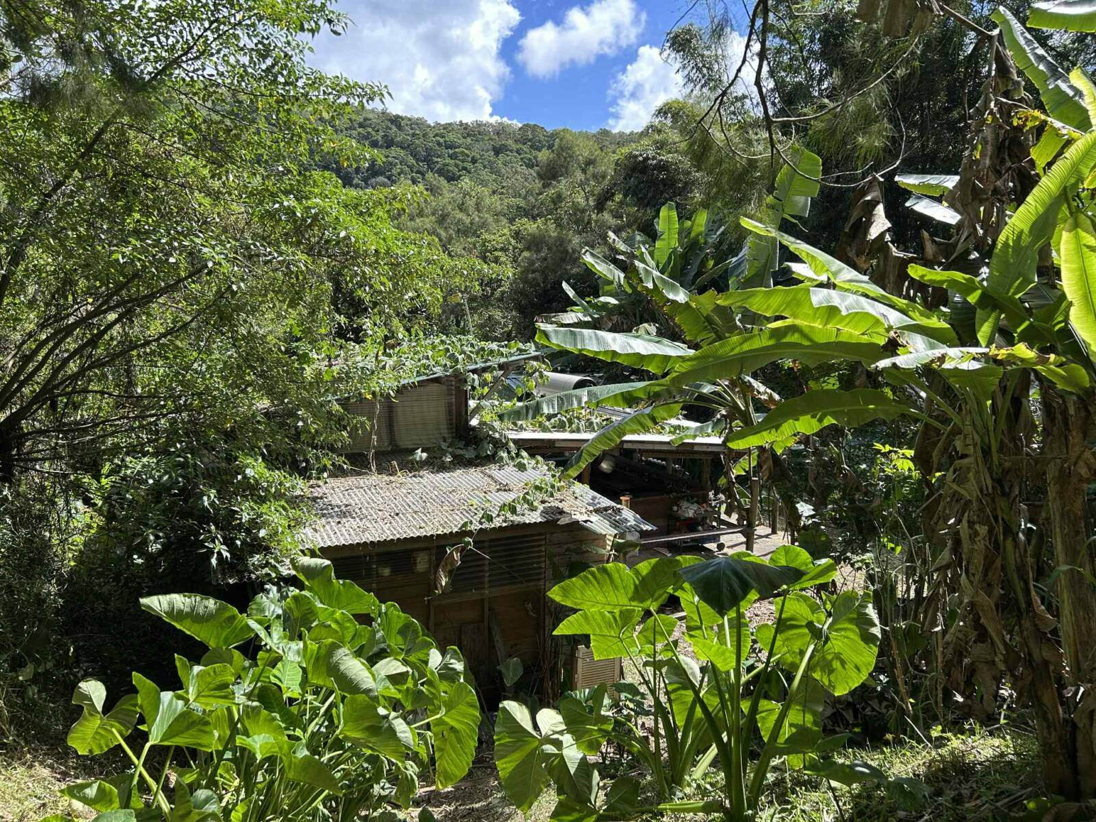 Sur la partie la plus pentue qui a été segmentée, 6000 m2 sont exploités pour un jardin en permaculture irrigués par arrosage automatique, avec 70 buttes de permaculture certifiés Bio Calédonia depuis 6 ans, 65 sortes de fruitiers ; orangers, mandariniers, citronniers, des caramboles… 100 bananiers, et une emplacement pour une vanilleraie de 200 pieds qu’il conviendra de relancer (en place 70 poteaux de Gaiacs).