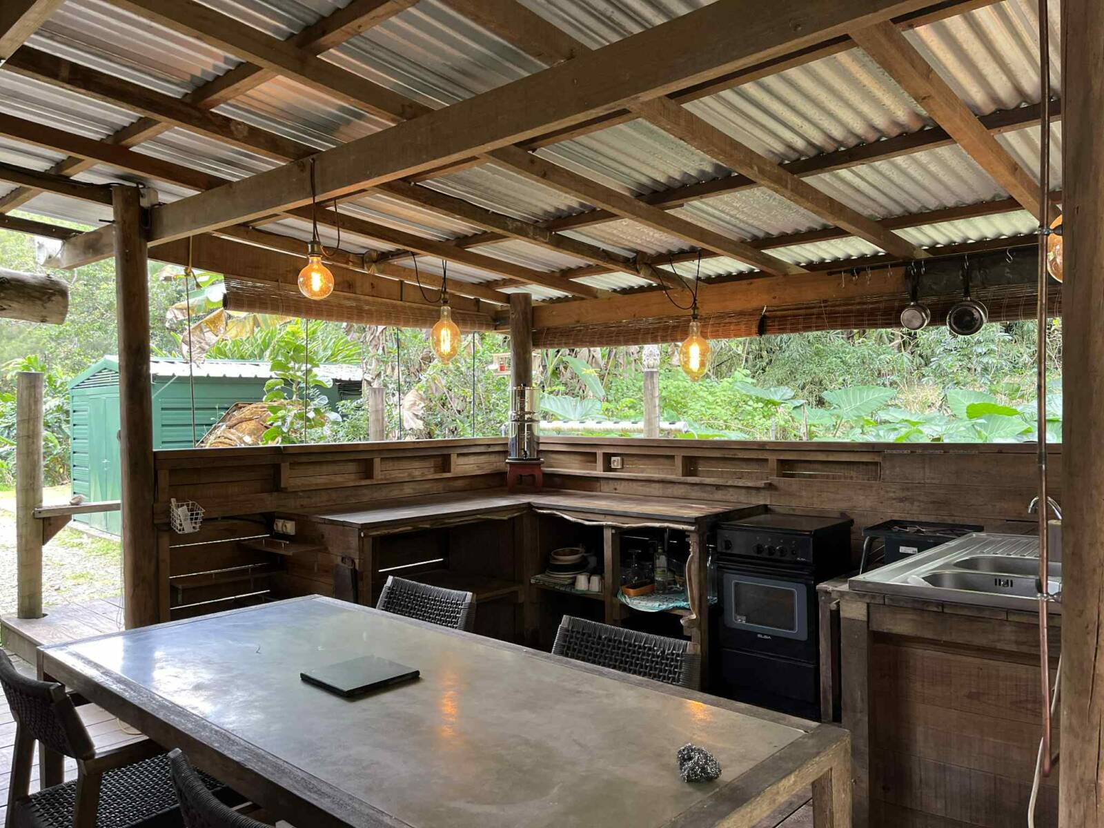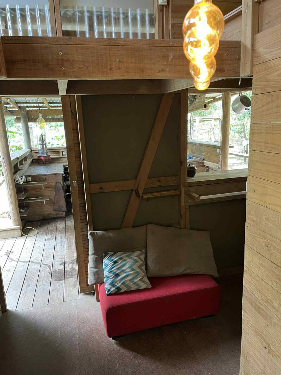 La maison bioclimatique « en bois tropical » sur pilotis de 70 m2 au sol, se compose d’une cuisine extérieure couverte, d’un salon, d’une salle d’eau avec toilettes sèches, et d’un espace nuit en mezzanine basse de plafond.