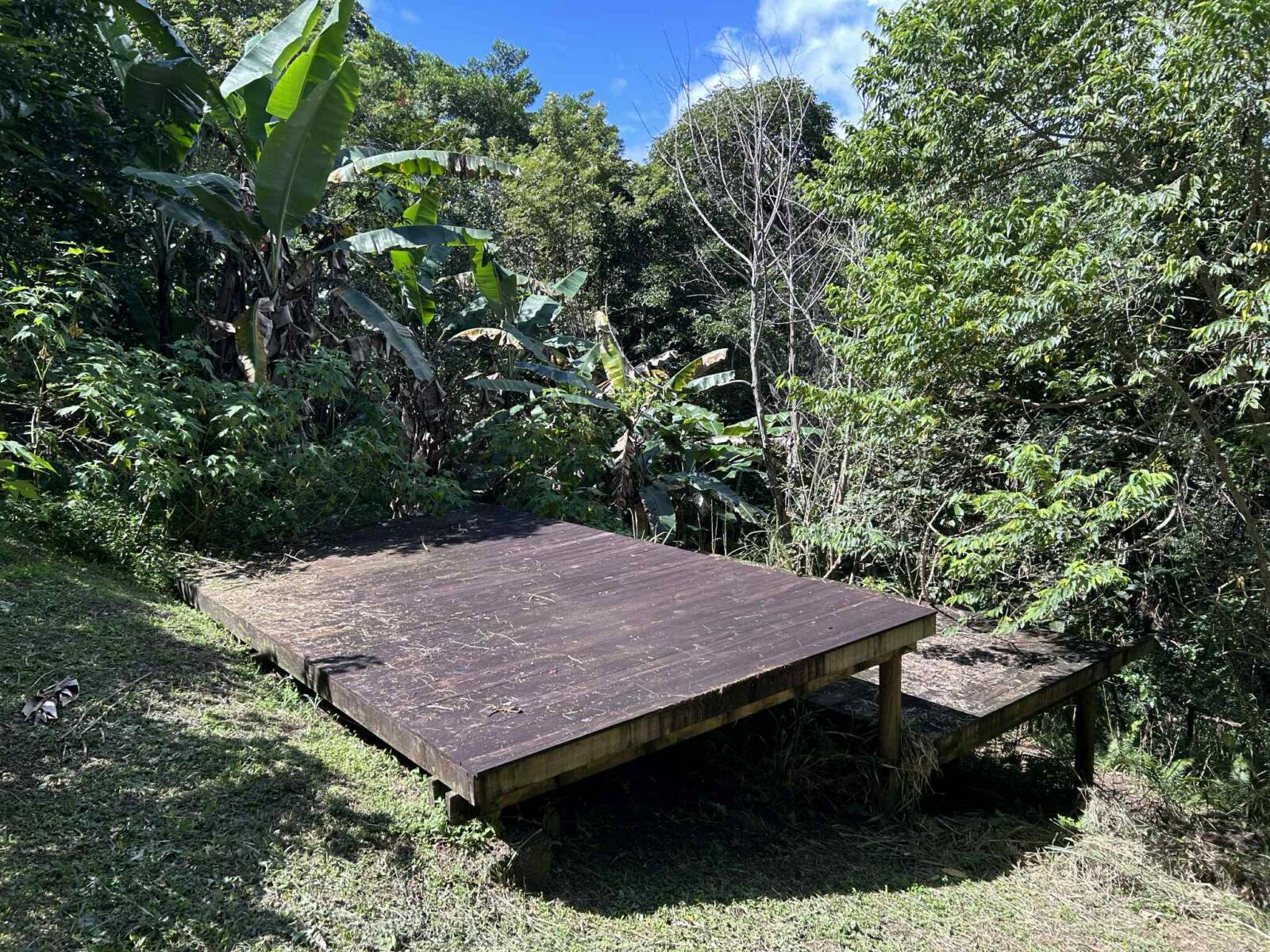 Sur une pente rendue accessible, et parsemée de 4 plateformes naturelles de 25m2 env. où s’y trouvent deux decks en pleine nature pouvant servir de base pour une construction.