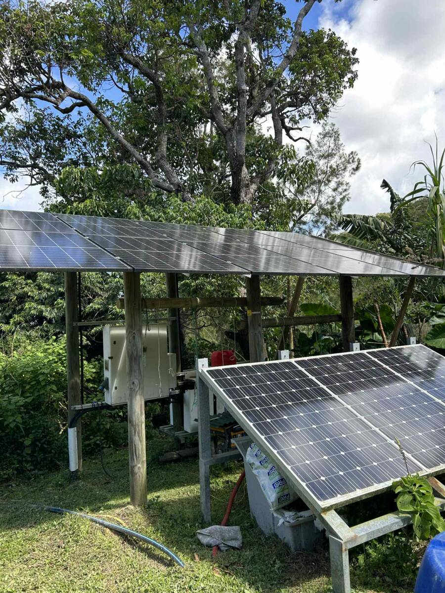 Pour l’eau ; 1 forage de 6 m3/heure alimenté par des panneaux solaires de 75OW, 1 pompe, 1 surpresseur, et 1 cuve de 7m3 pour stockage.