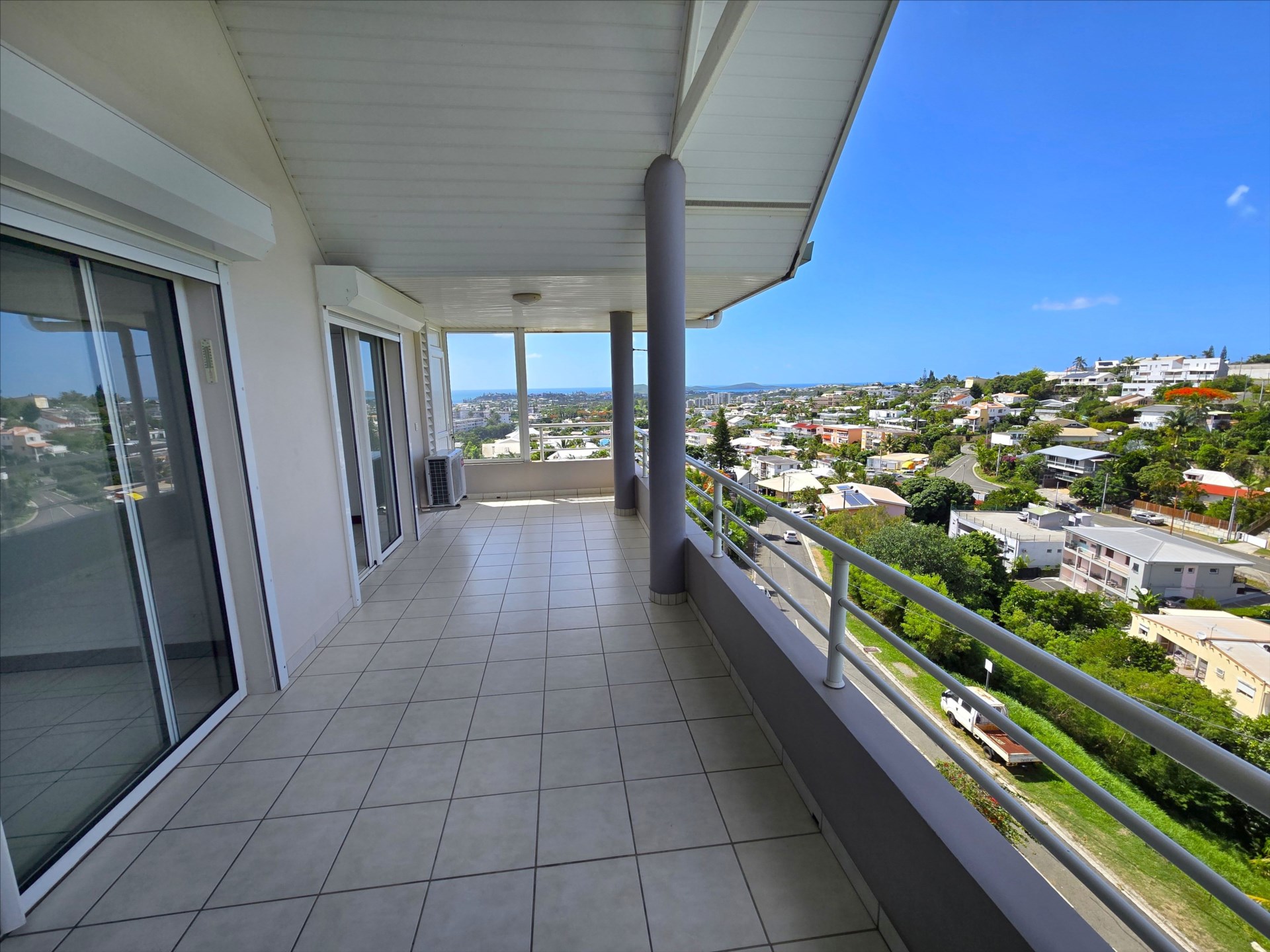 Au dernier étage avec ascenseur, F3 + mezzanine de 93m², belle terrasse de 21 m² avec superbe vue mer, séjour, cuisine équipée, 2 chambres, mezzanine, salle d'eau, 2 wc, 2 parkings + cellier, sur les hauteurs, rue Verlaine, proximité Parc Forestier. Libre le 29 décembre.