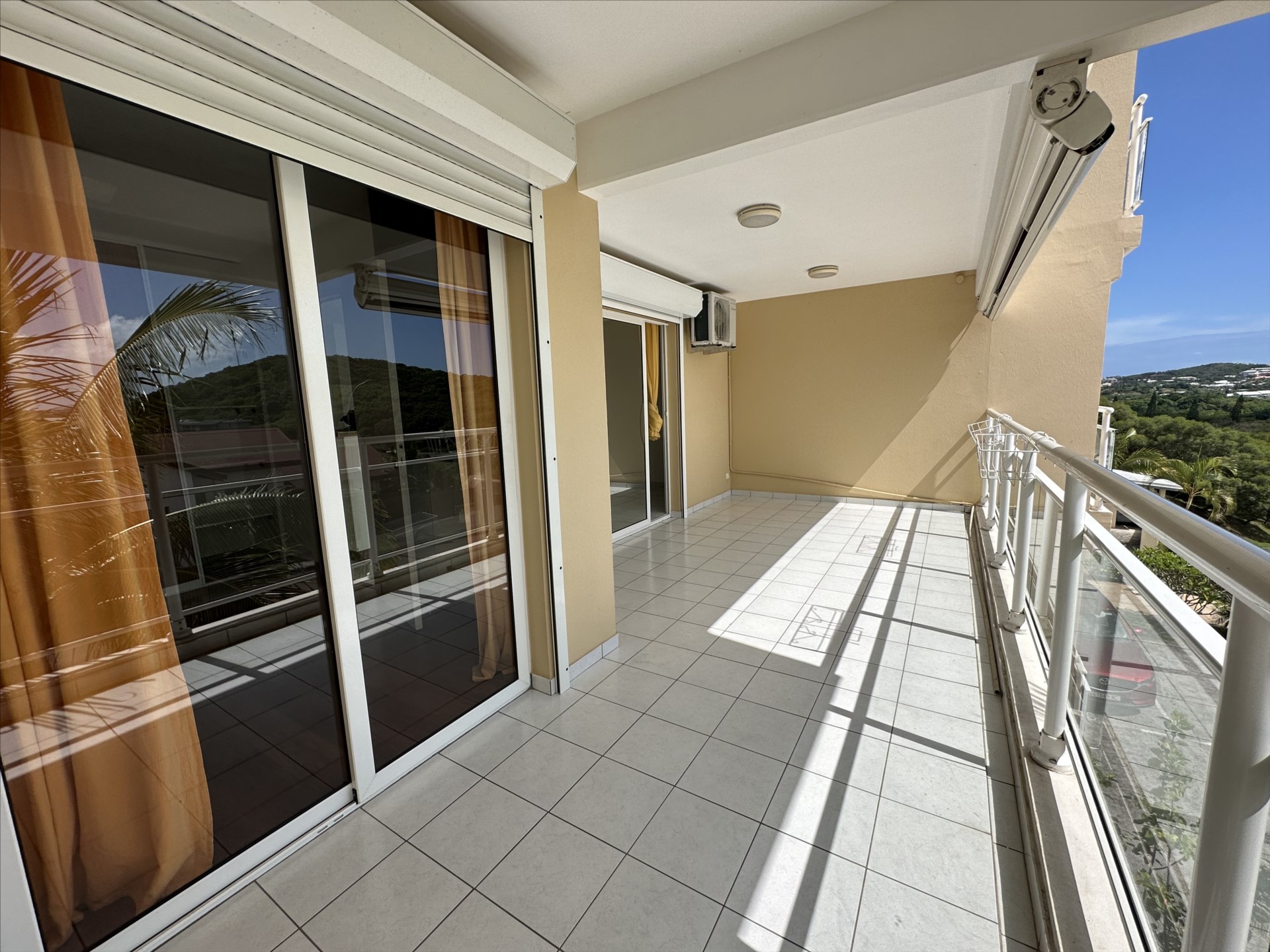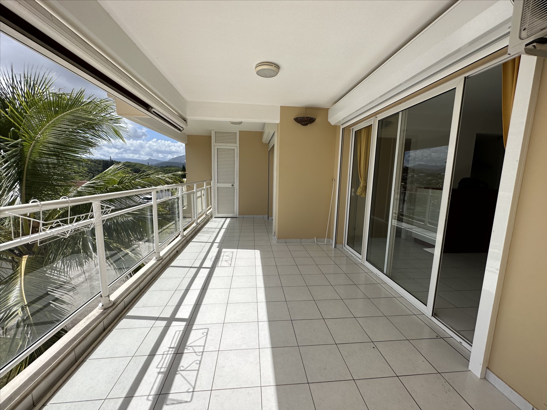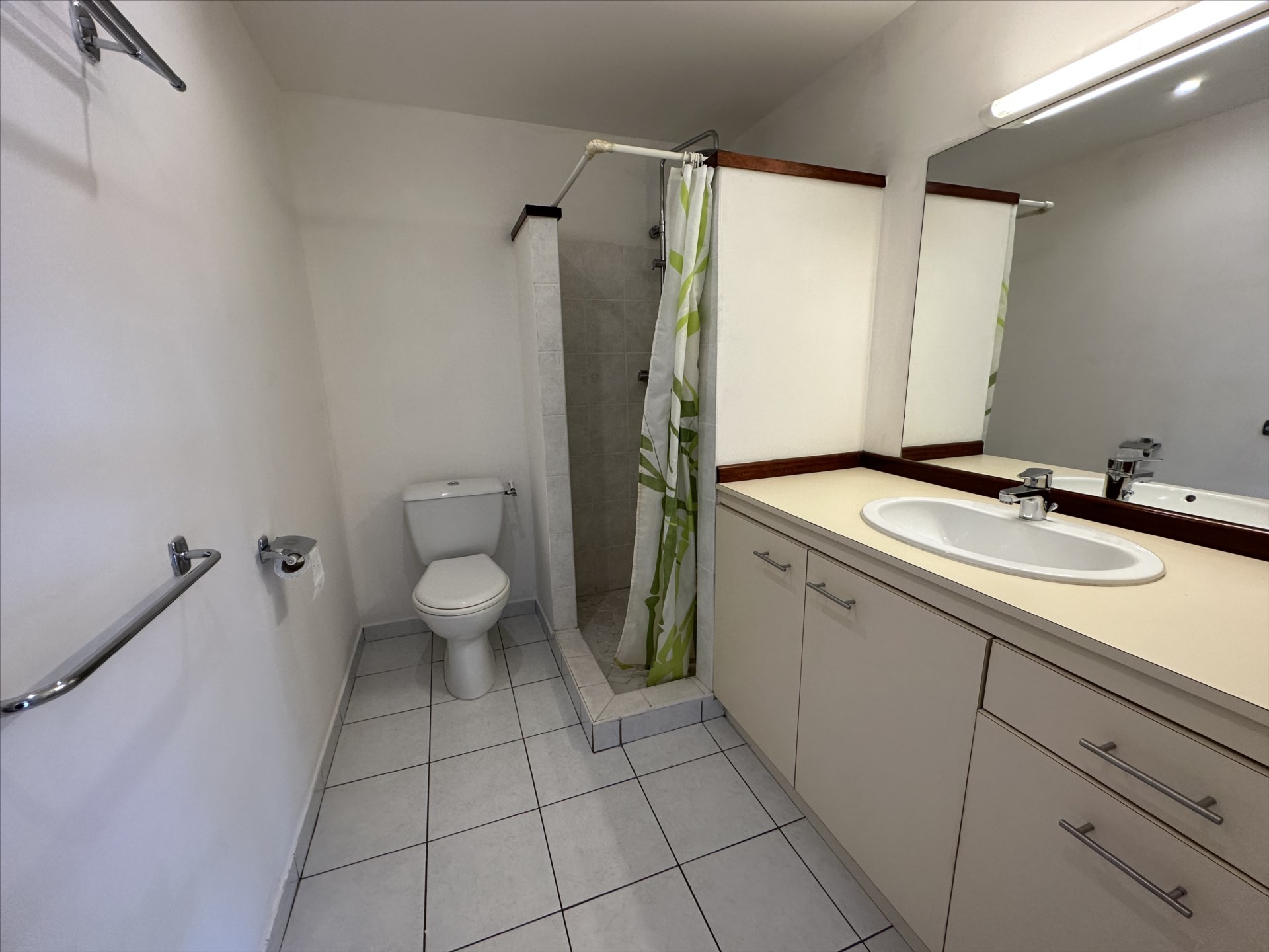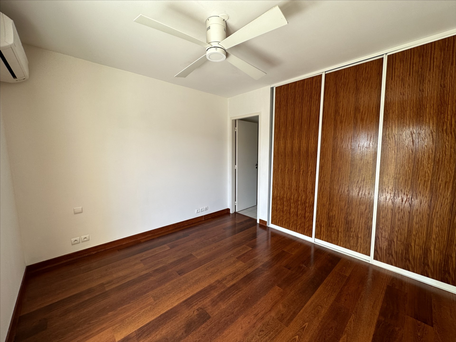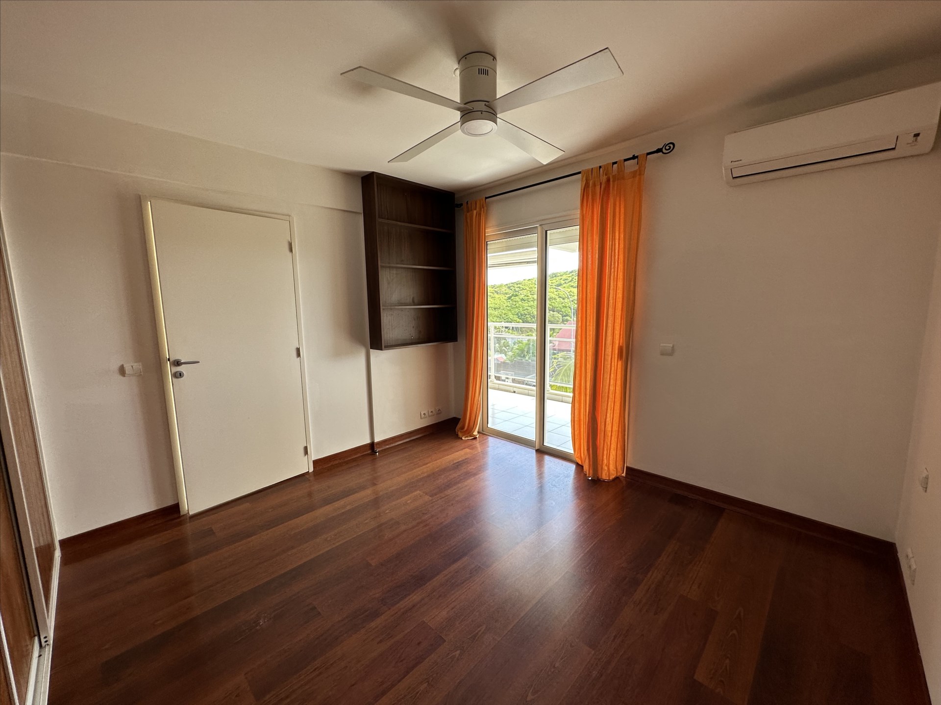 La chambre également climatisée est équipée d'un grand placard d'une baie vitrée avec volet roulant électrique donnant acces à la terrasse ainsi que d'une salle d'eau.
