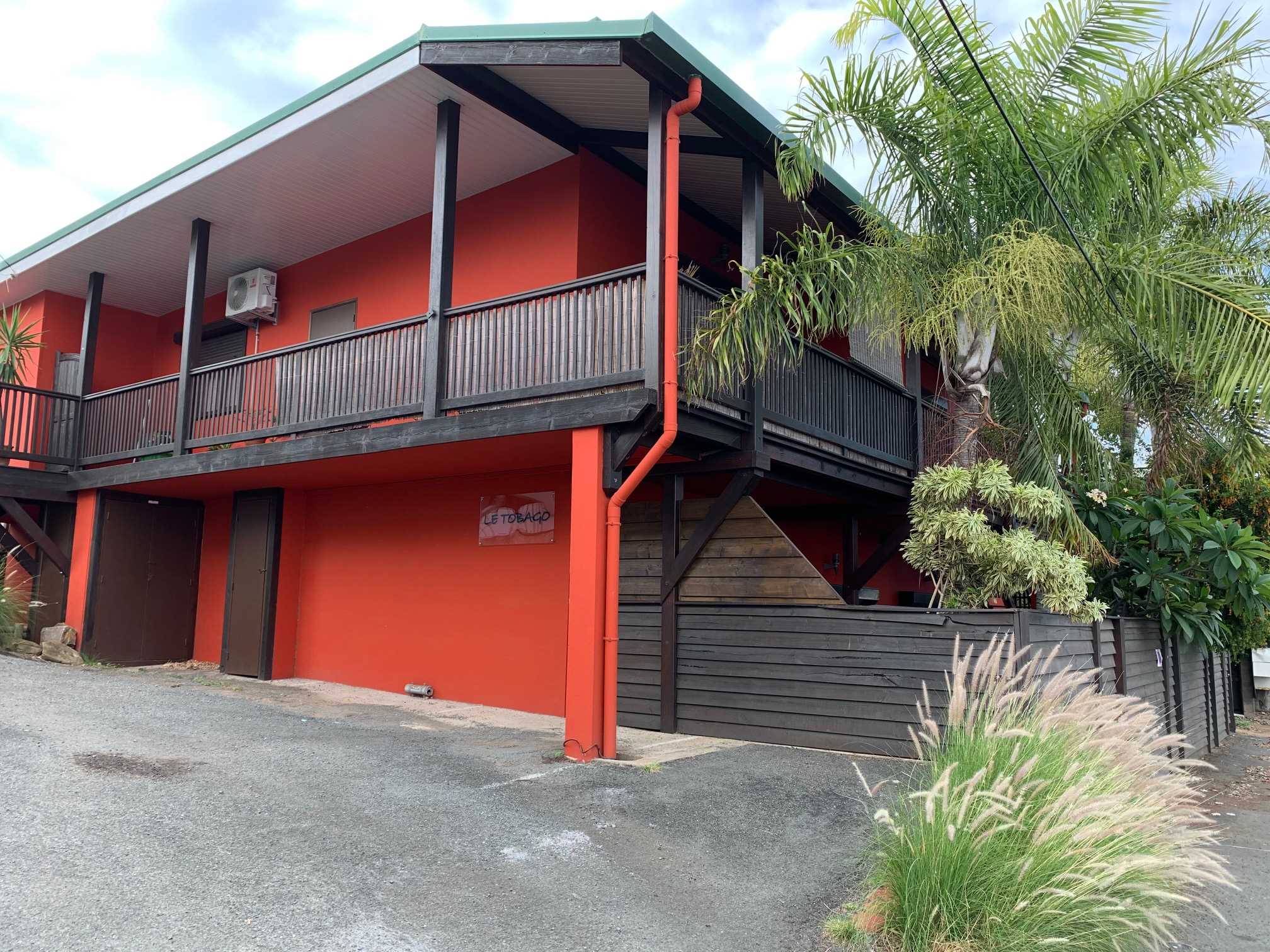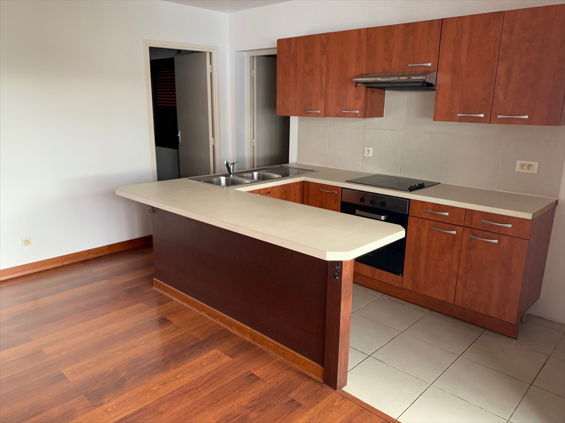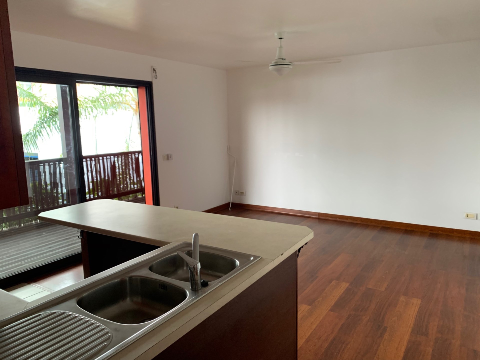 Ouemo, F3 dans petite copropriété, entrée privative, belle pièce principale, cuisine équipée (plaques, hotte, four), 2 chambres placard , clim et volet, belle terrasse