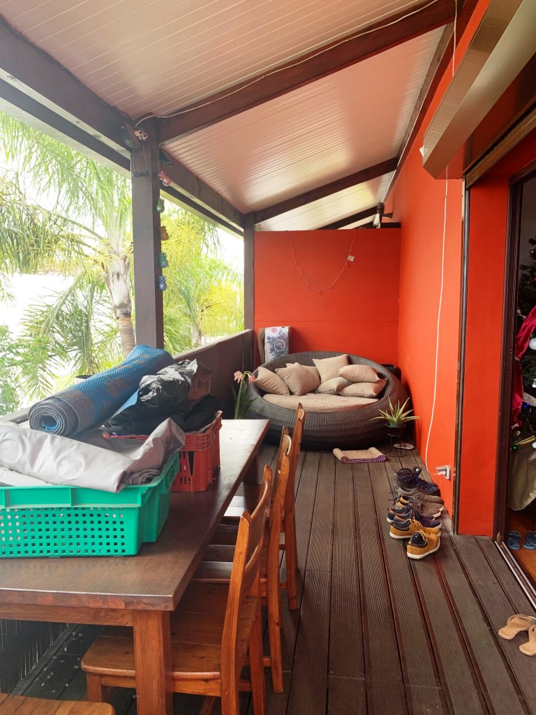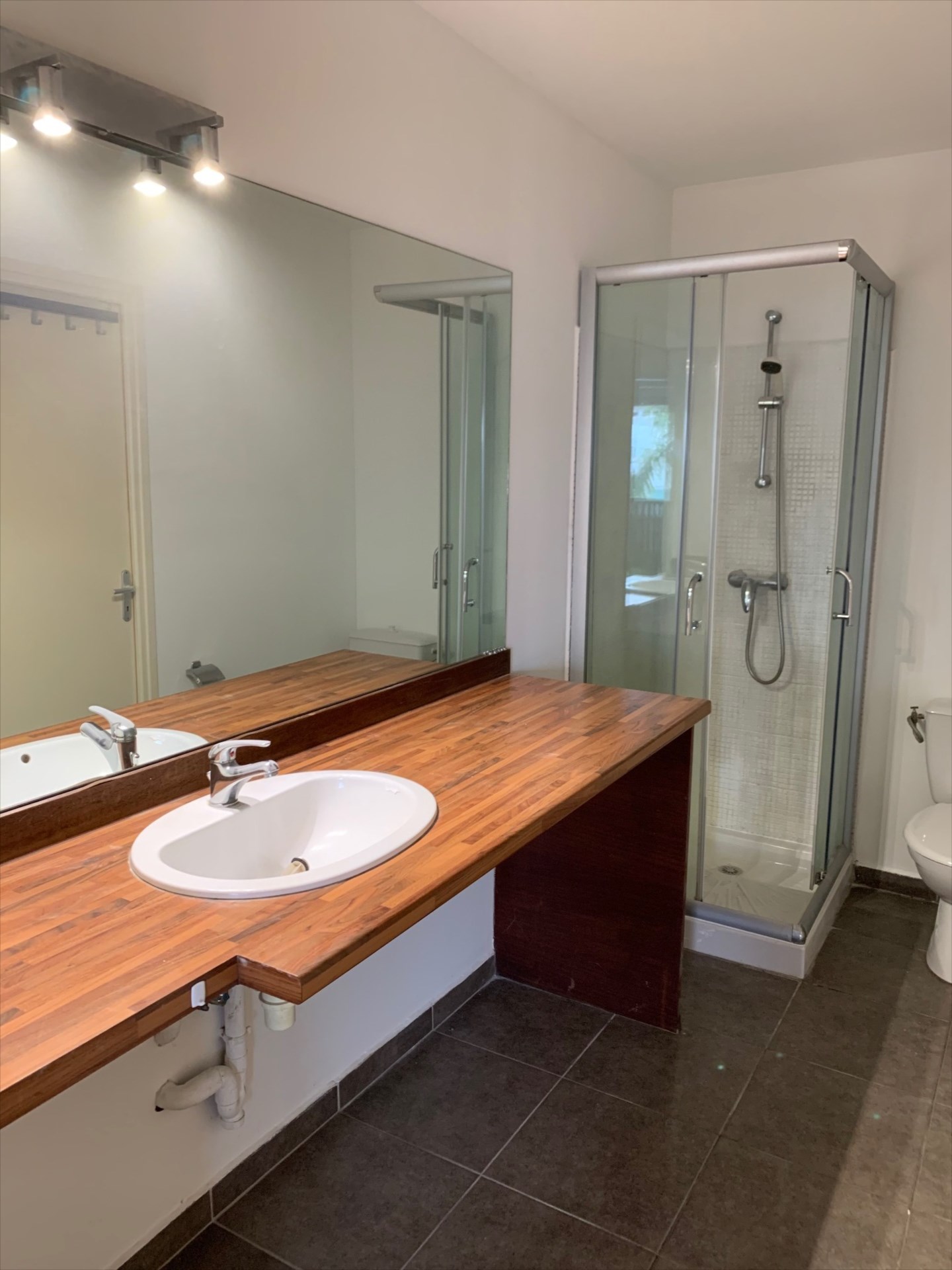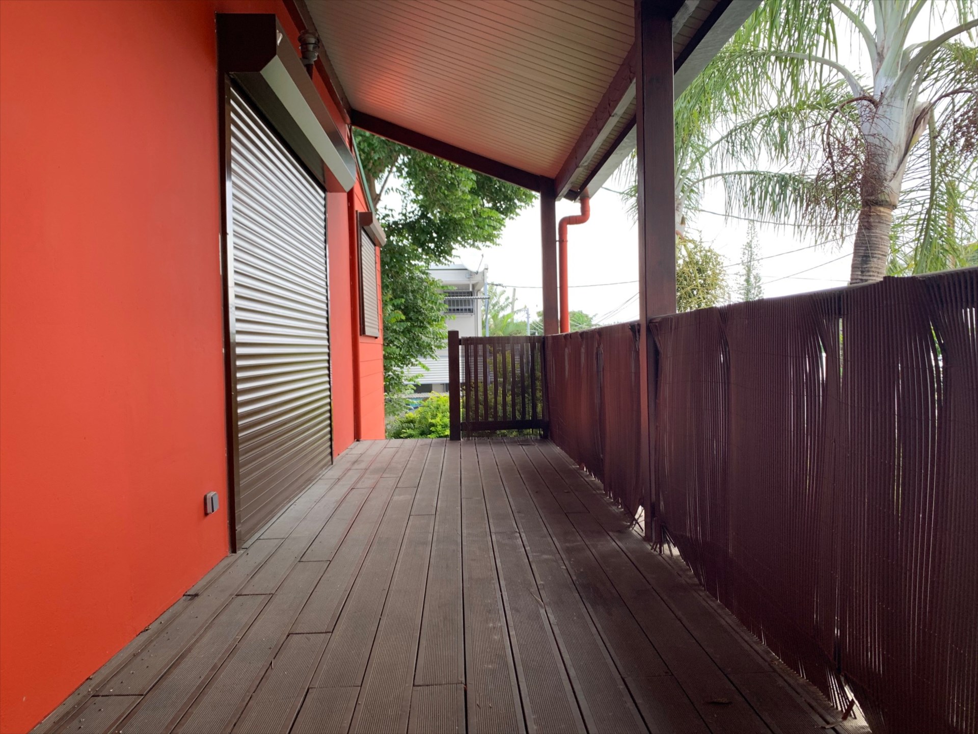 Ouemo, F3 dans petite copropriété, entrée privative, belle pièce principale, cuisine équipée (plaques, hotte, four), 2 chambres placard , clim et volet, belle terrasse