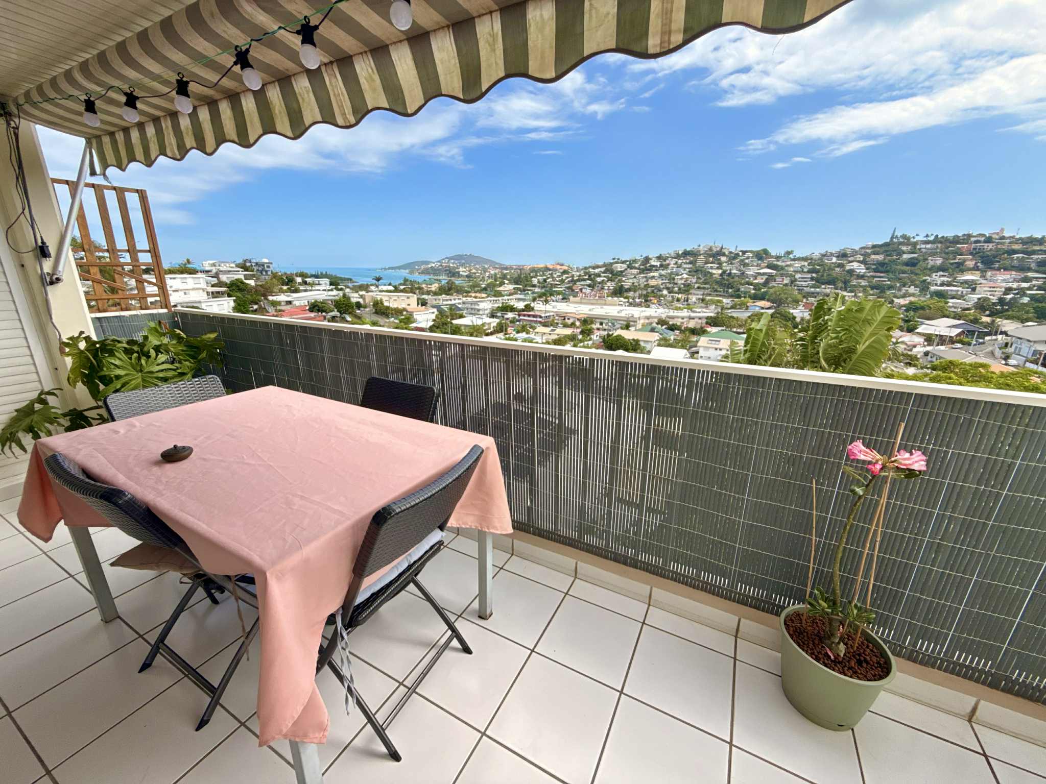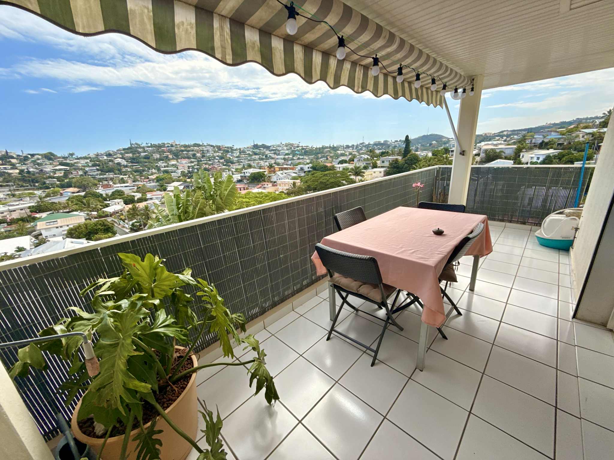La terrasse de 10 m² permet de profiter d’une belle vue dégagée à plus de 180°, sans vis-à-vis, avec aperçu mer, et est équipée d’un store manuel.