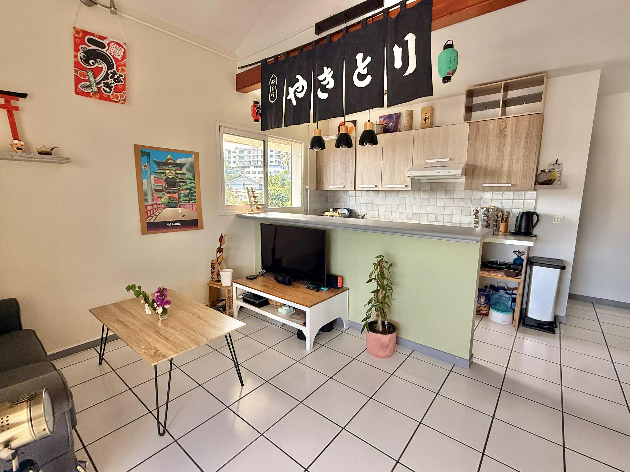 Le séjour, situé entre la cuisine et la terrasse, offre un espace convivial.