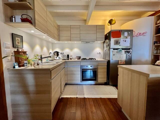 Cuisine équipée, séjour, salle à manger chaleureuse