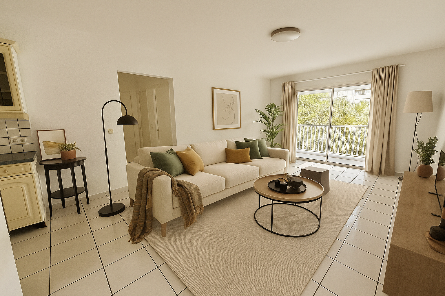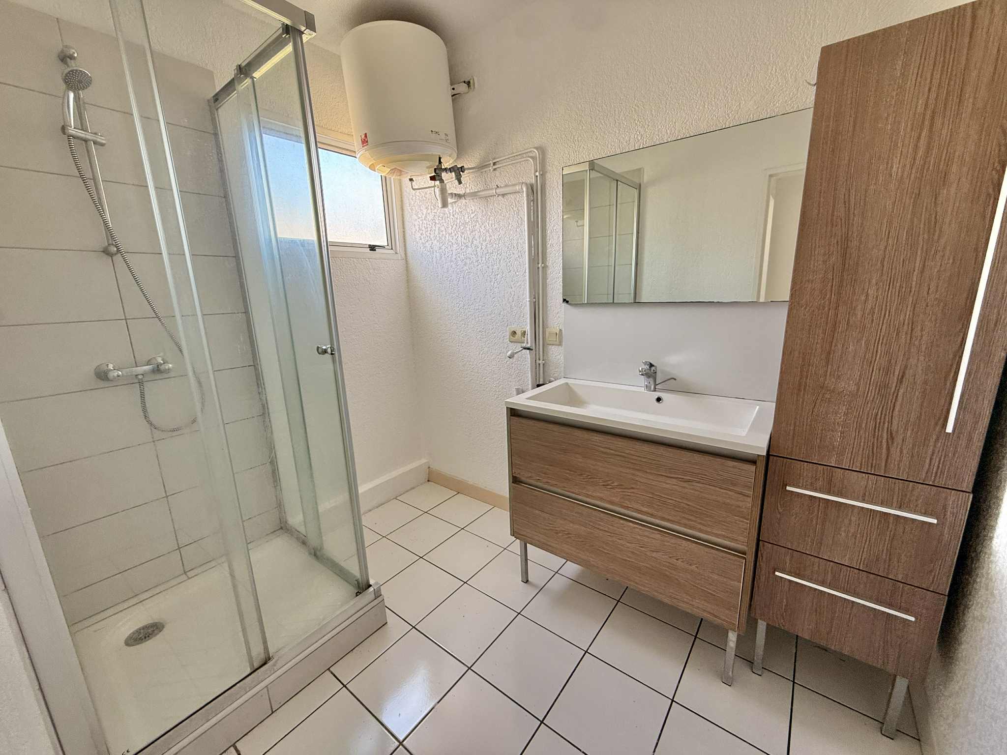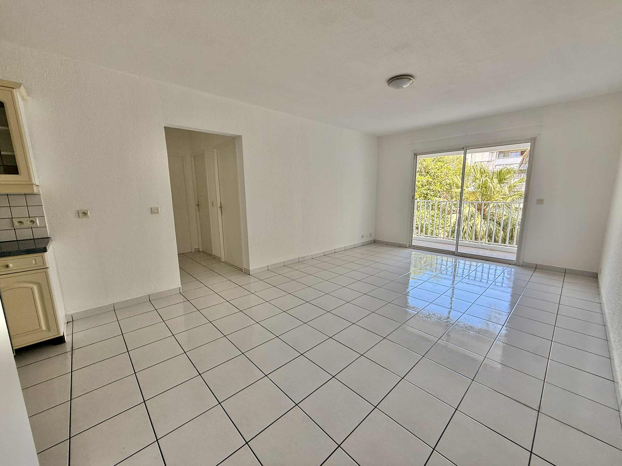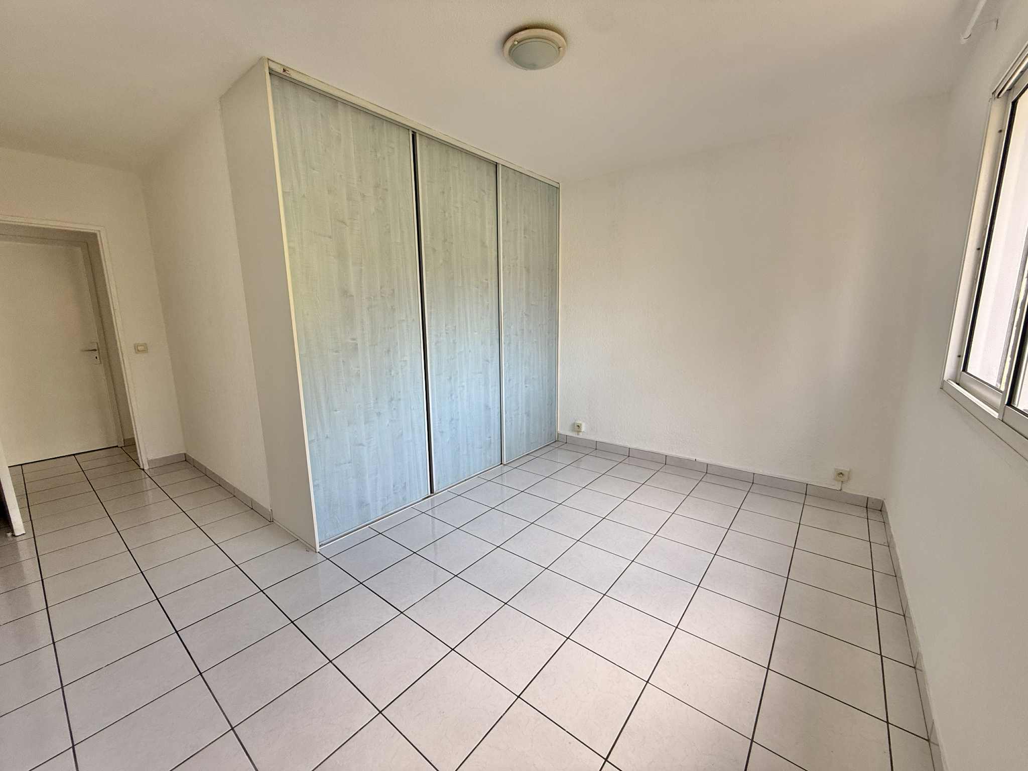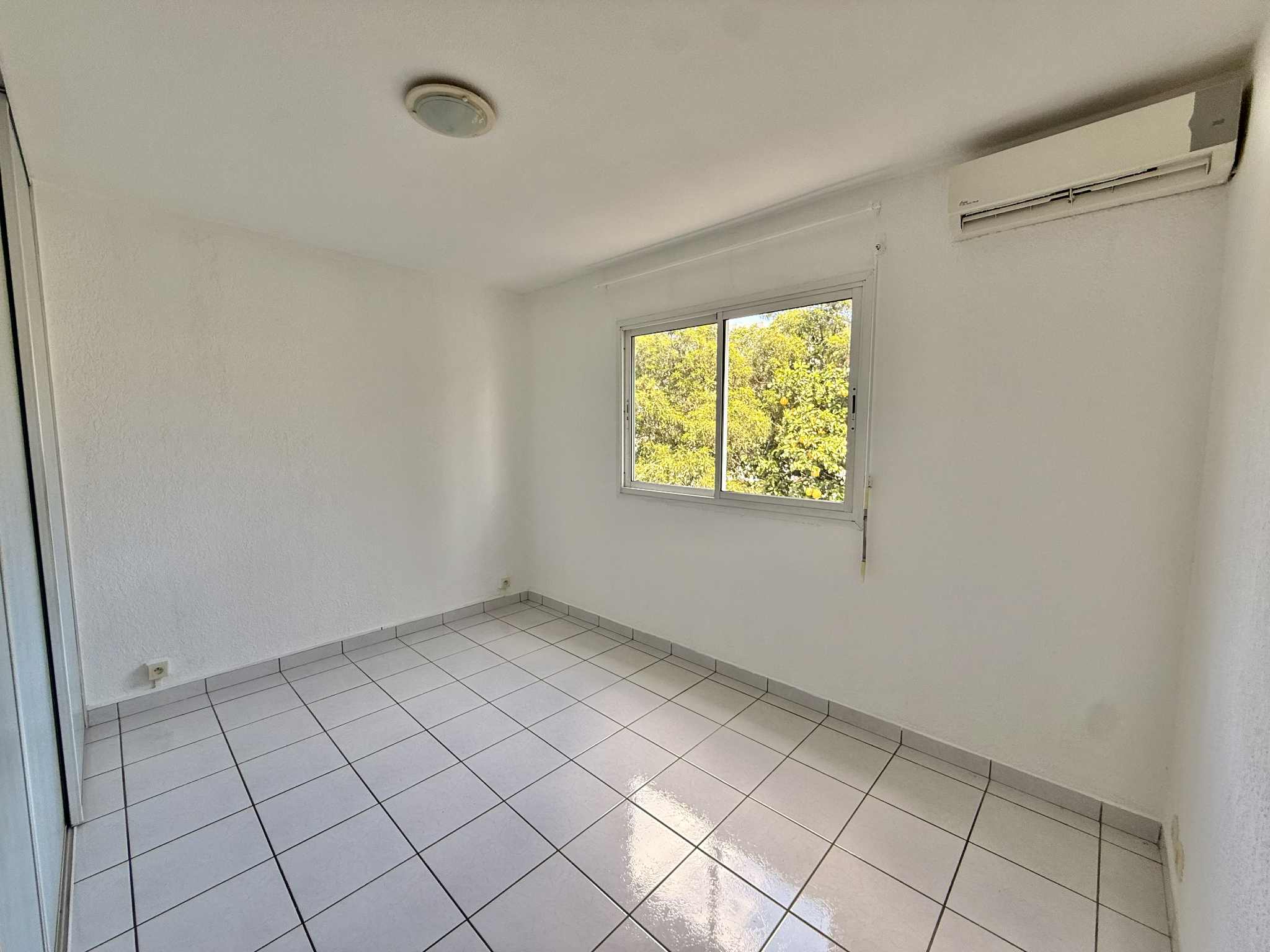 Il comprend une cuisine équipée avec de nombreux rangements ouverte sur le séjour, deux chambres climatisées avec placard et volets roulants manuels, une salle d’eau et des toilettes indépendantes.