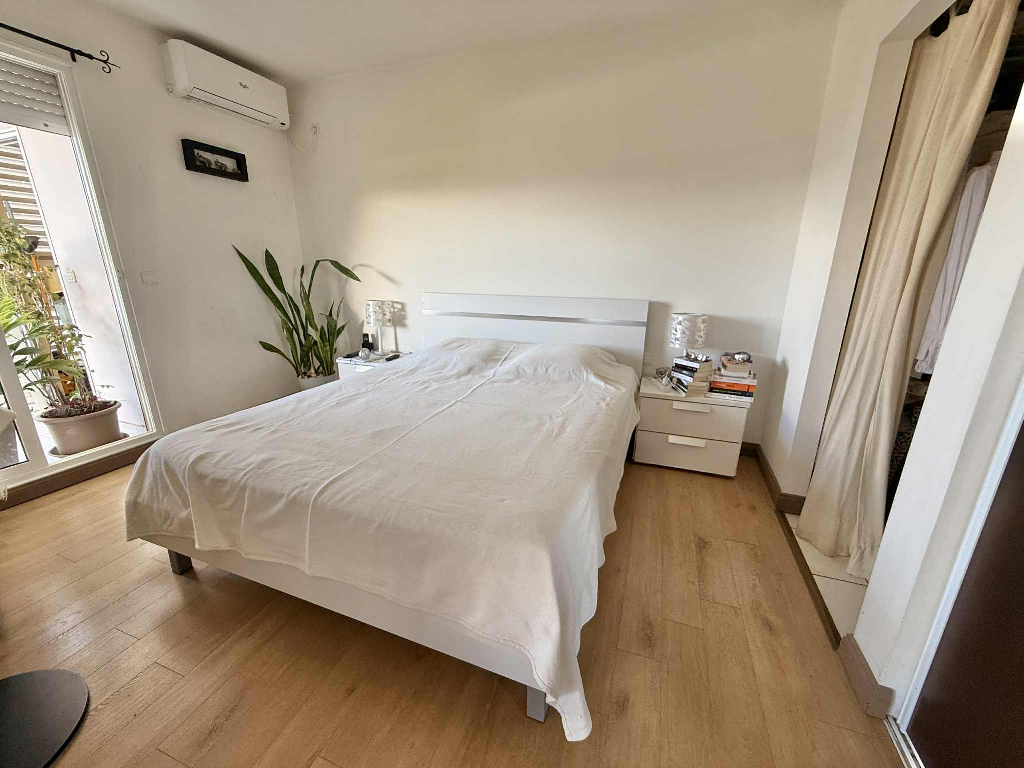 La chambre climatisée, équipée d’un volet roulant électrique, dispose d’une large baie vitrée donnant également sur la terrasse. Elle comprend un grand dressing. Salle d’eau moderne et WC séparé.