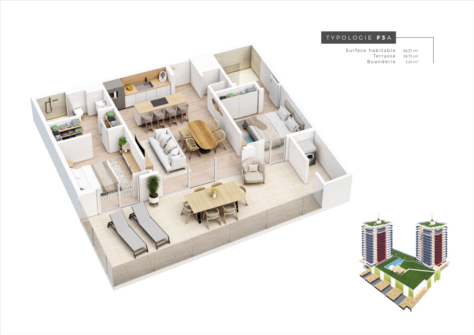 Une vaste terrasse de 29.73 m² avec buanderie, prolonge les espaces de vie, parfaite pour admirer les couchers de soleil.