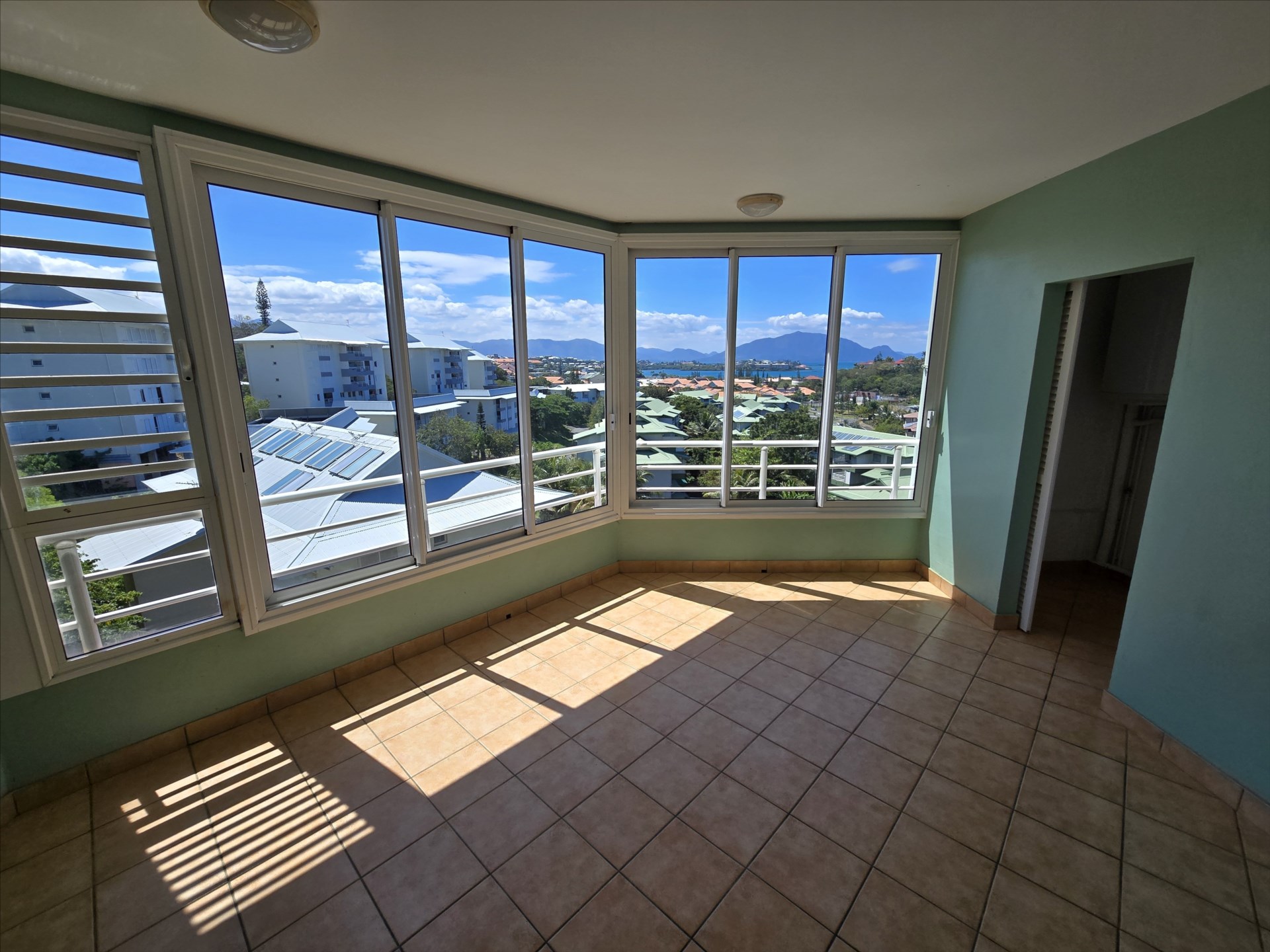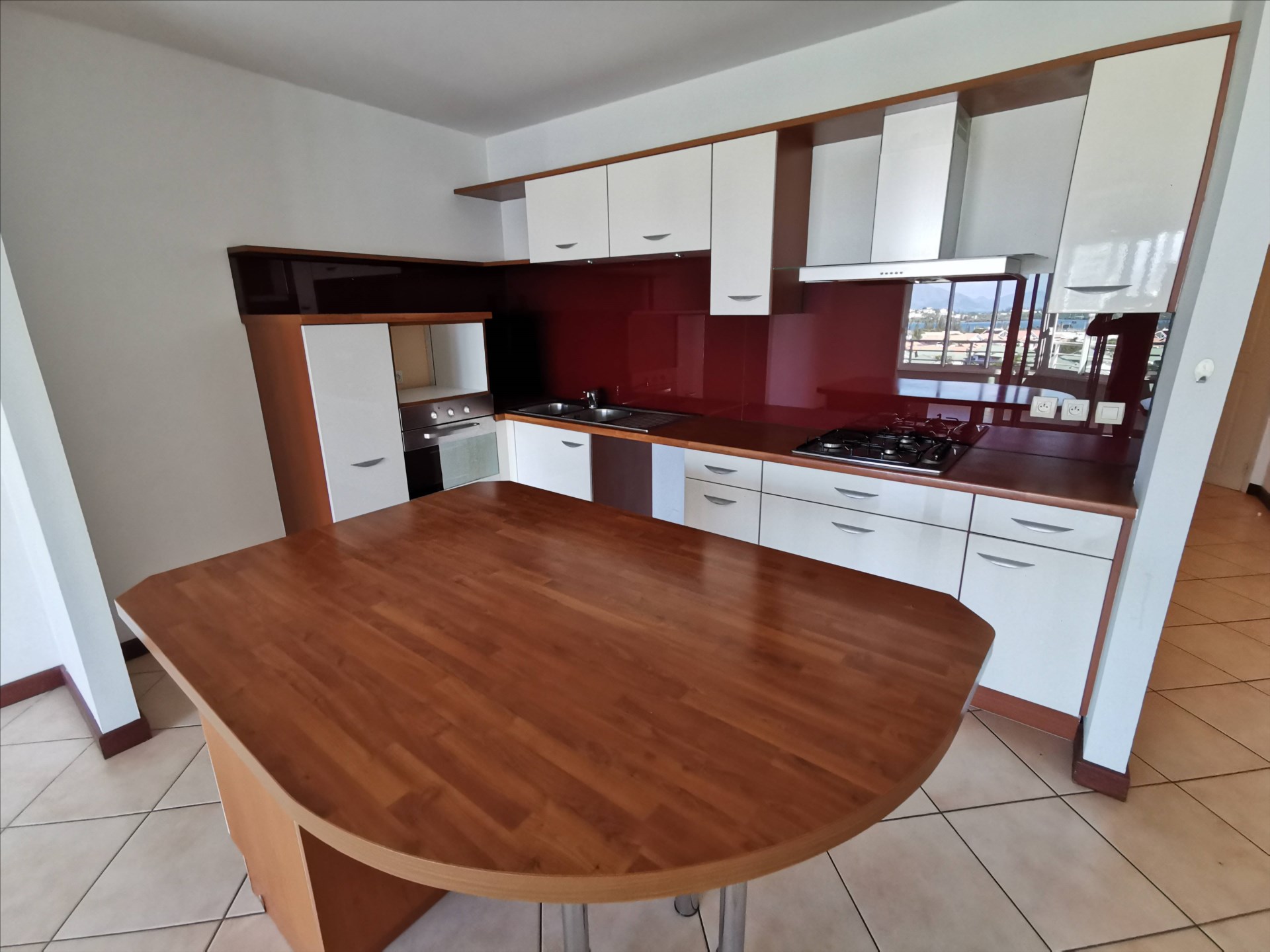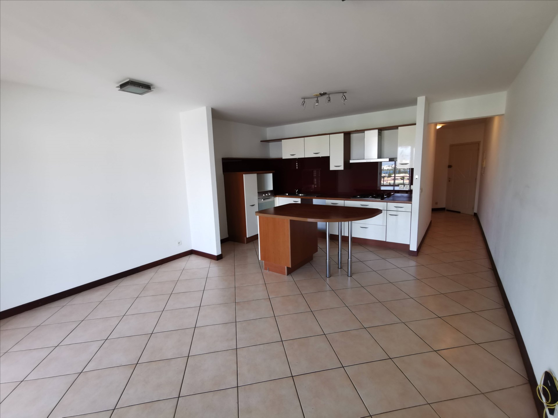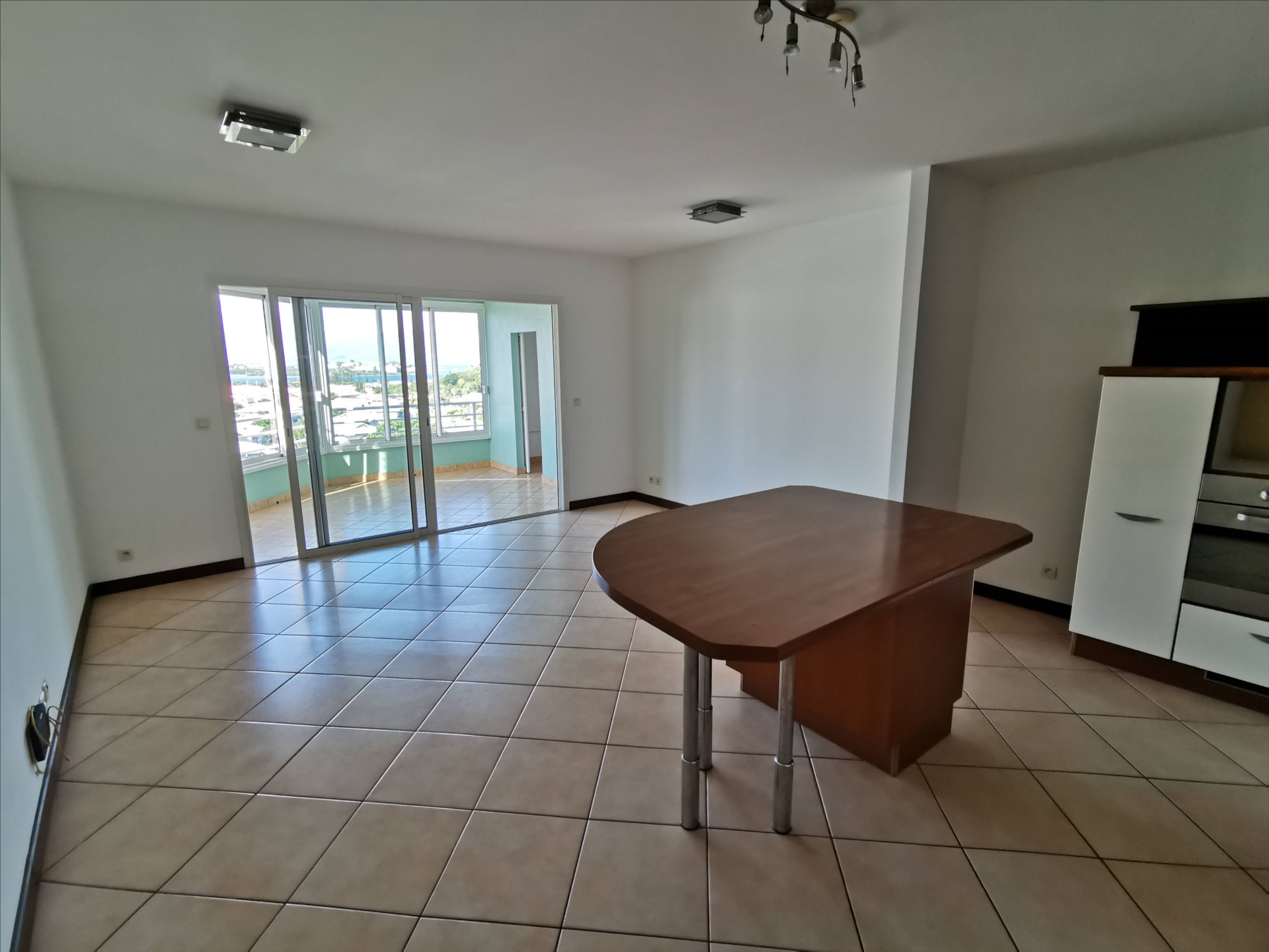 F3 de 81 m² avec terrasse fermée, traversant, position dominante, vue mer, séjour avec cuisine équipée, 2 chambres avec placard, salle d'eau/wc, 2 pkgs en s.sol, cellier, calme en fond d'impasse, rue S. Dumont. Libre début Mars