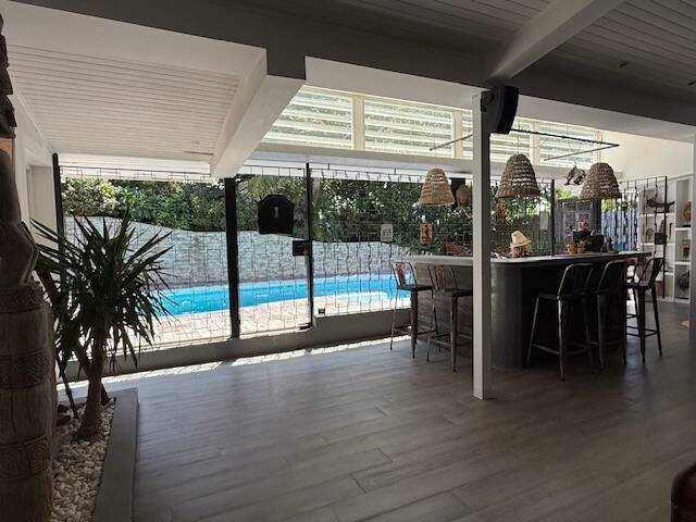 • un séjour patio avec bar et cheminée coté piscine
